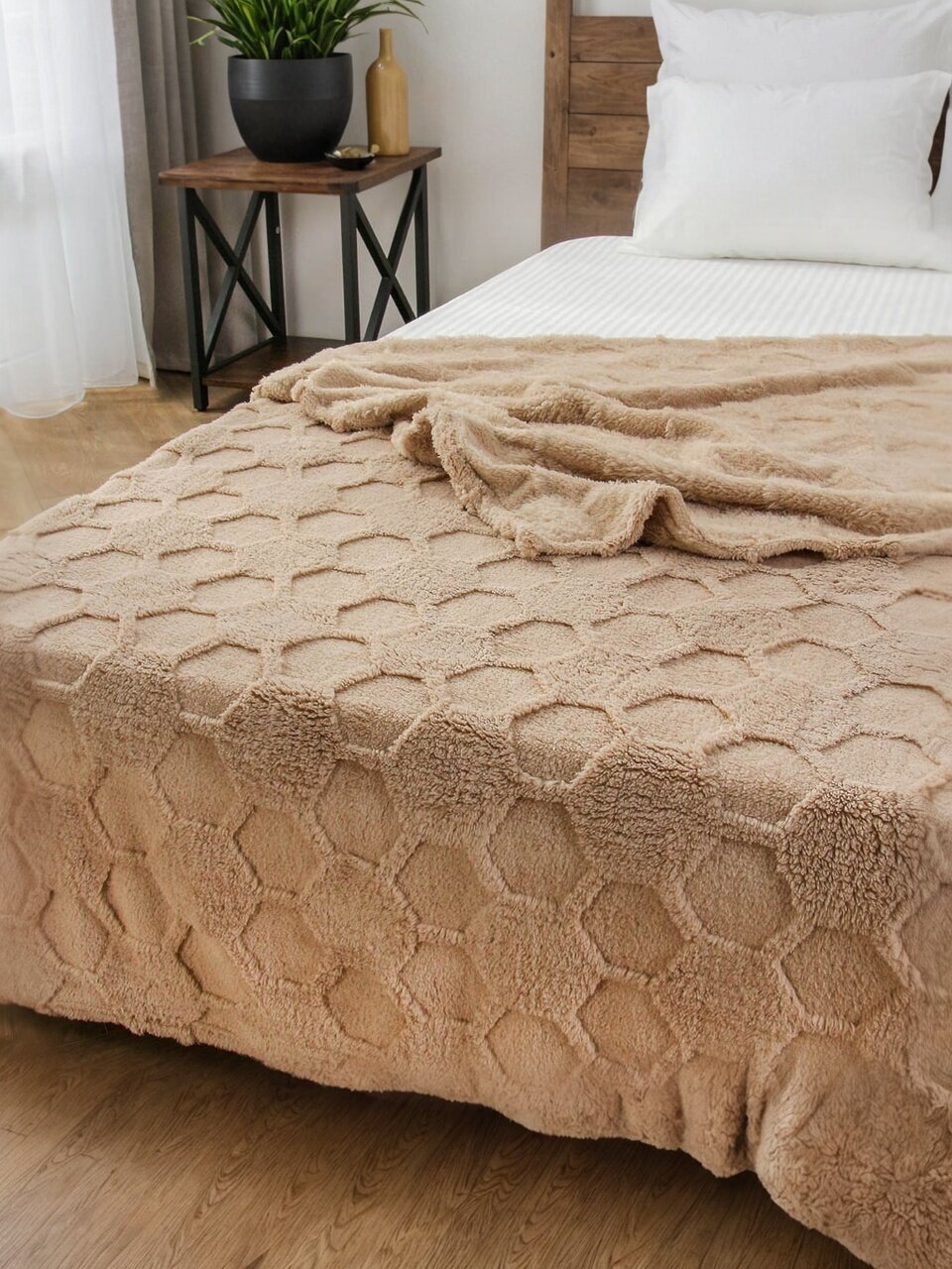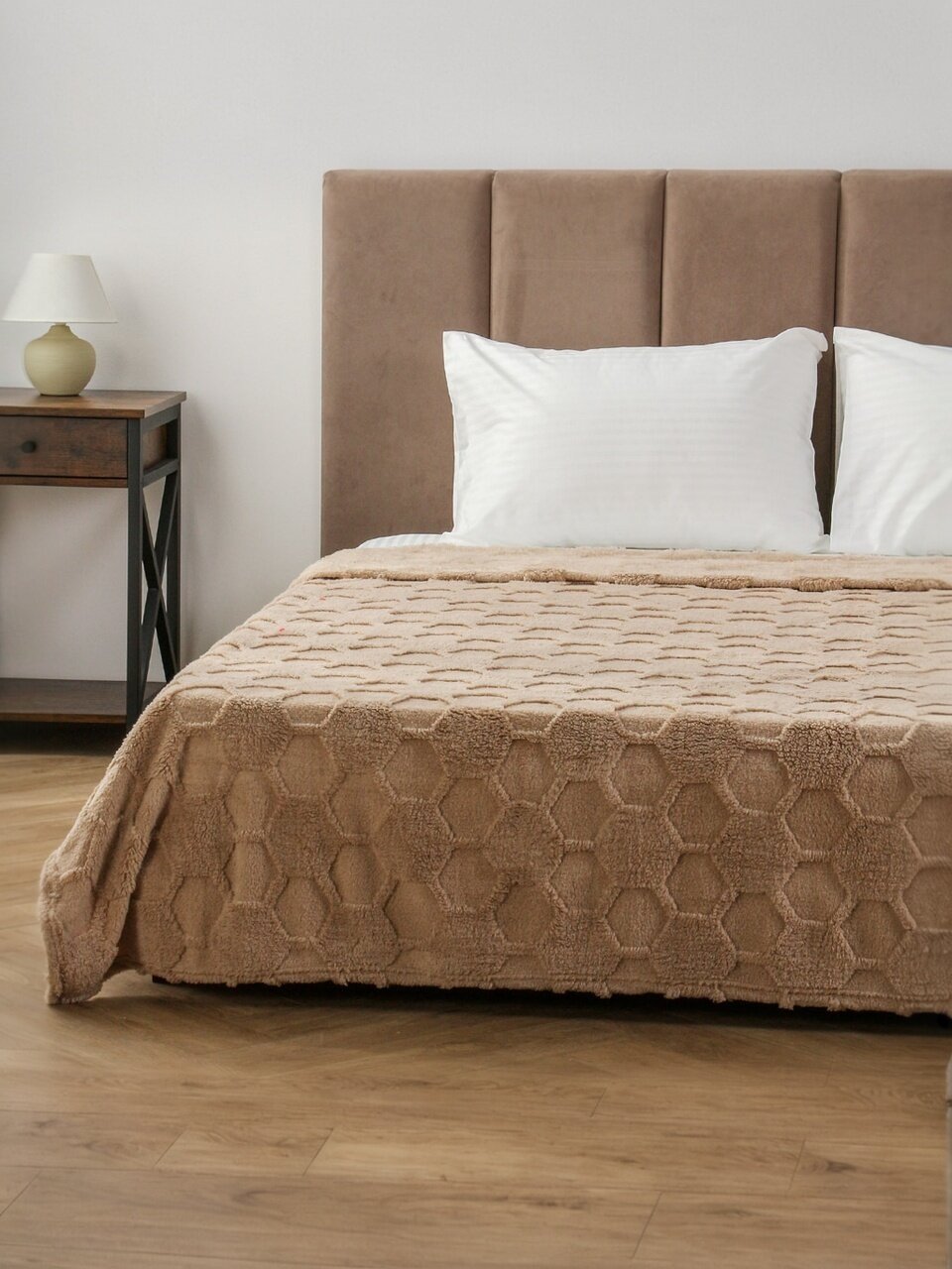 Плед евро 200х220 см из велсофта жаккард Silvano — это современное решение для тех, кто ищет, какой плед выбрать для уютного отдыха или стильного интерьера. Материал — 100% полиэстер с коротким ворсом, что обеспечивает мягкость, гипоаллергенность и простоту ухода. Благодаря однотонному бежевому цвету и лаконичному дизайну «Соты» изделие легко впишется в любой интерьер: от классики до минимализма.