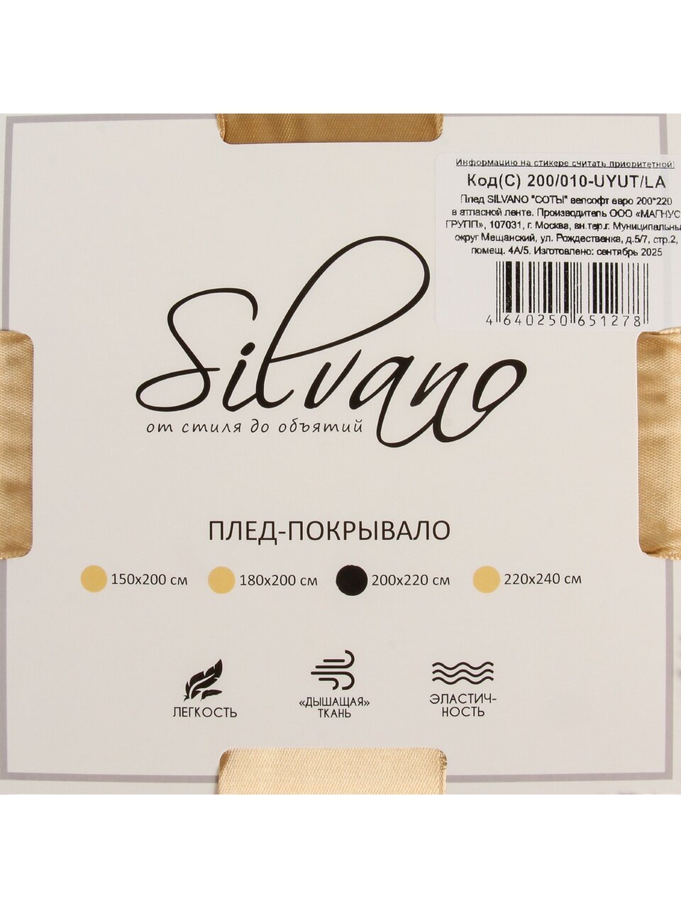 Размер пледа — евро, 200х220 см. Он подходит для двуспальных и евро-кроватей, а также для использования как покрывало на диван.