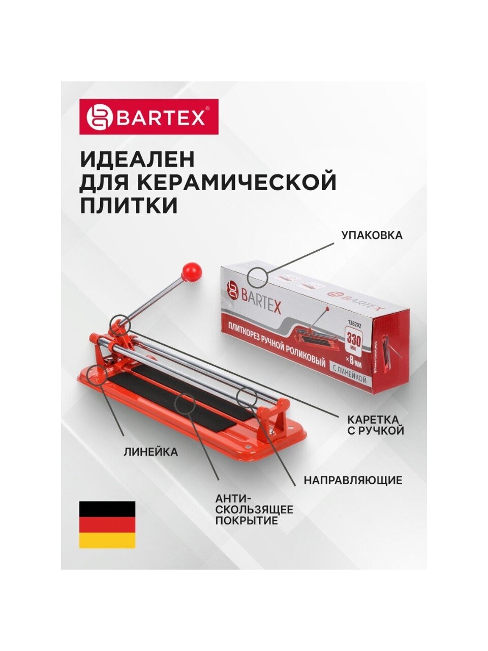 Предусмотреть все нюансы ремонта невозможно. Зачастую, уже в процессе работ, возникают ситуации, где Вам просто необходимо нарезать напольную или настенную плитку нужного размера. На помощь придет ручной плиткорез Bartex. Он производит идеально ровный рез при помощи ролика. Продольное ребро служит для надлома плитки по направляющему каналу.