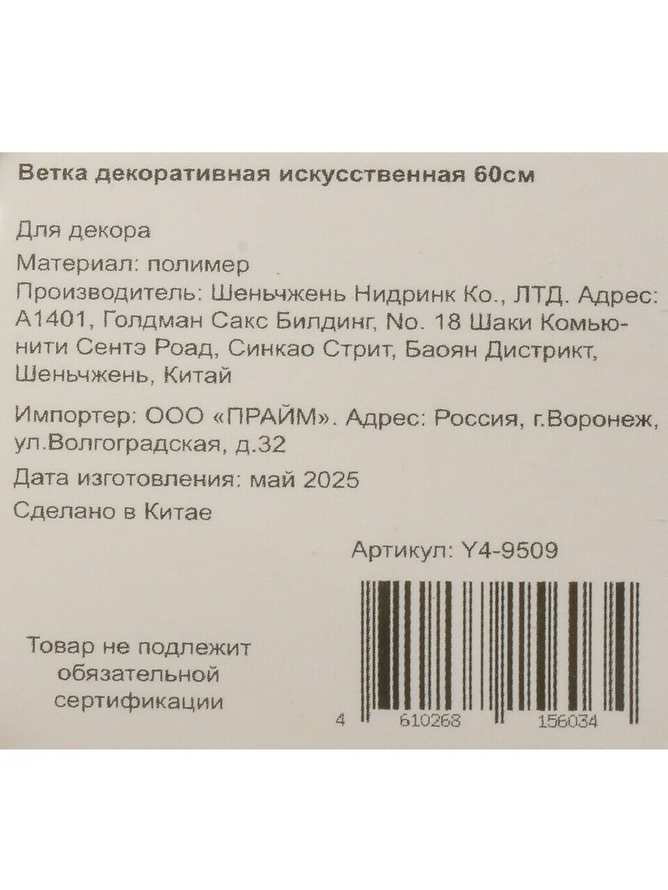 Ветка выполнена из безопасных искусственных материалов, не имеет постороннего запаха, не вызывает аллергии, страна производства — Китай.