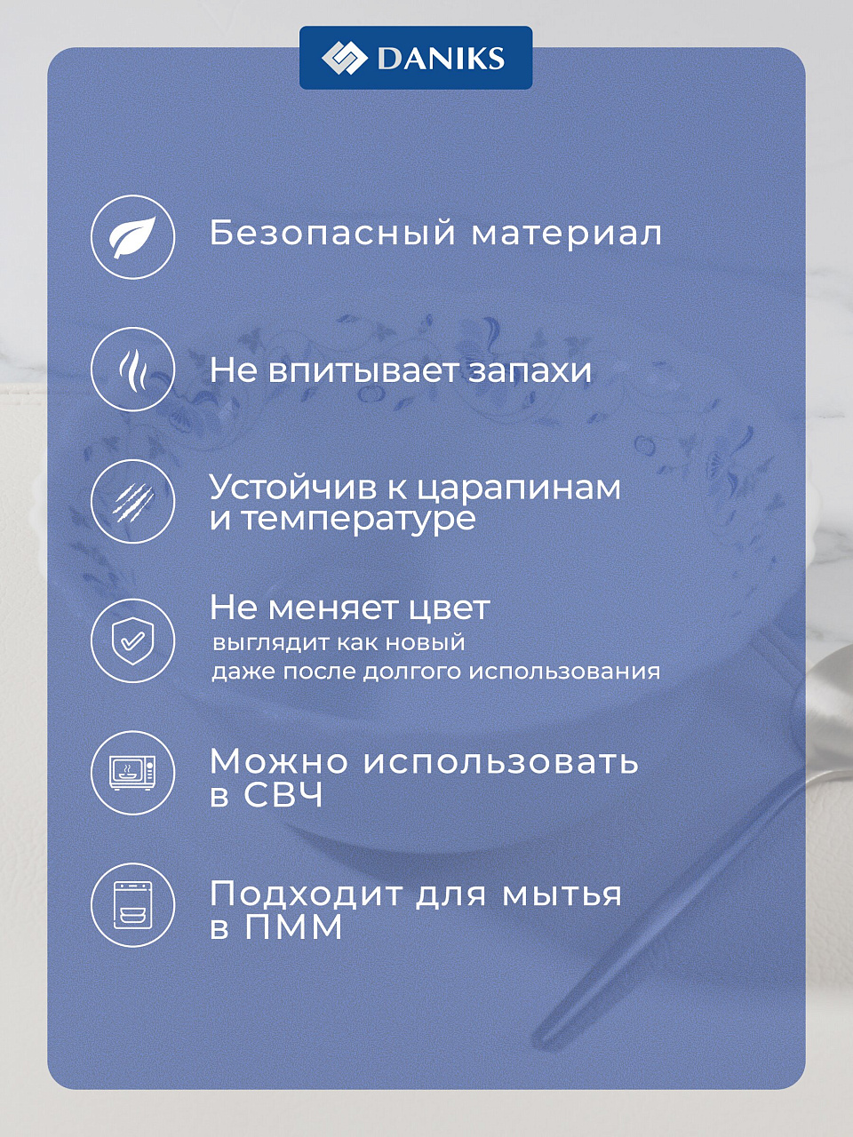 Он прочный, не окрашивается от овощей, легко моется, выдерживает смену температур — подходит для сервировки, хранения и разогрева блюд.