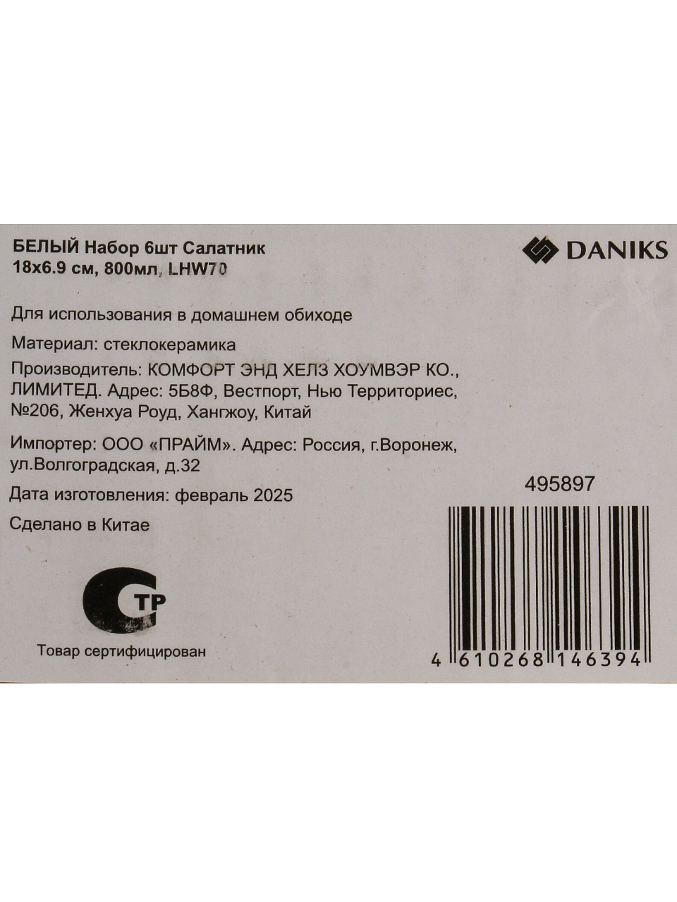 Салатники Daniks из стеклокерамики: 6 прочных мисок 0,8 л, идеальны для сервировки, подходят для СВЧ и посудомойки. Стиль и удобство каждый день.