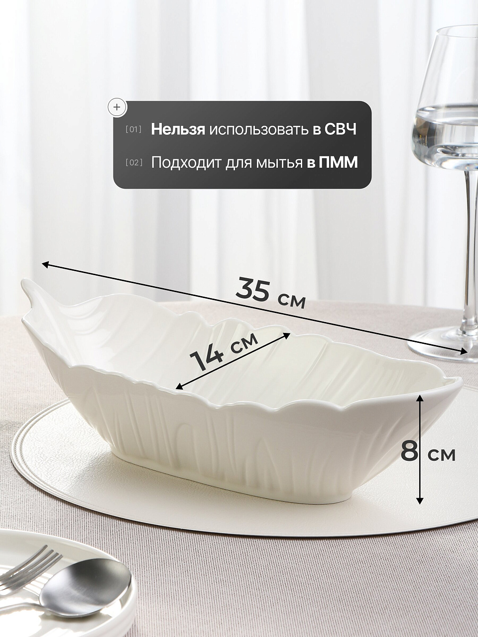 Размер 35х14х8 см позволяет сервировать блюда на 3–6 персон — оптимально для семейных обедов и небольших застолий.