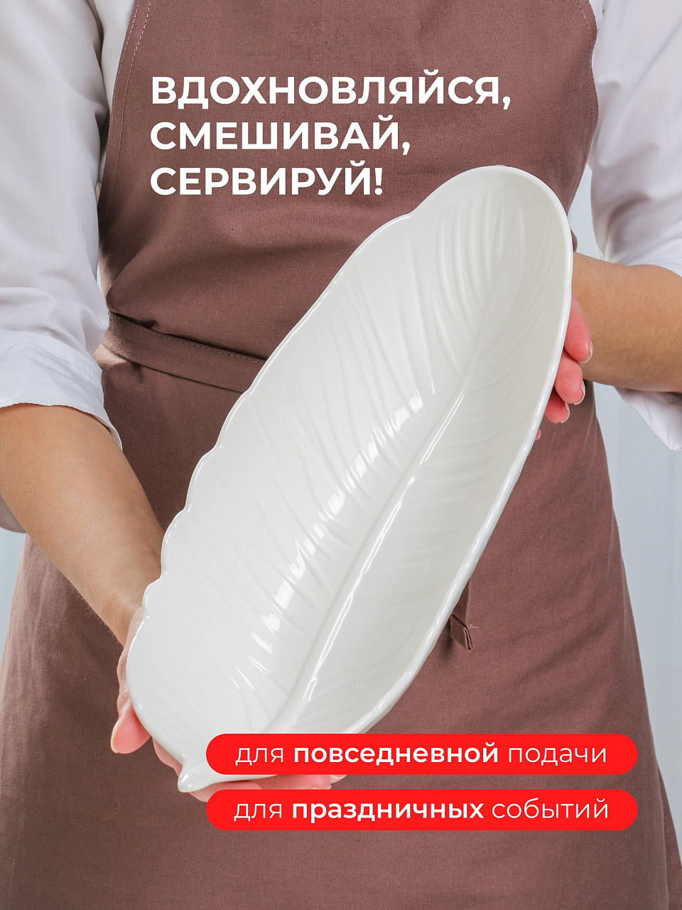 - Фигурный салатник с рельефным декором «лист» — акцент на тренде природных форм в интерьере.