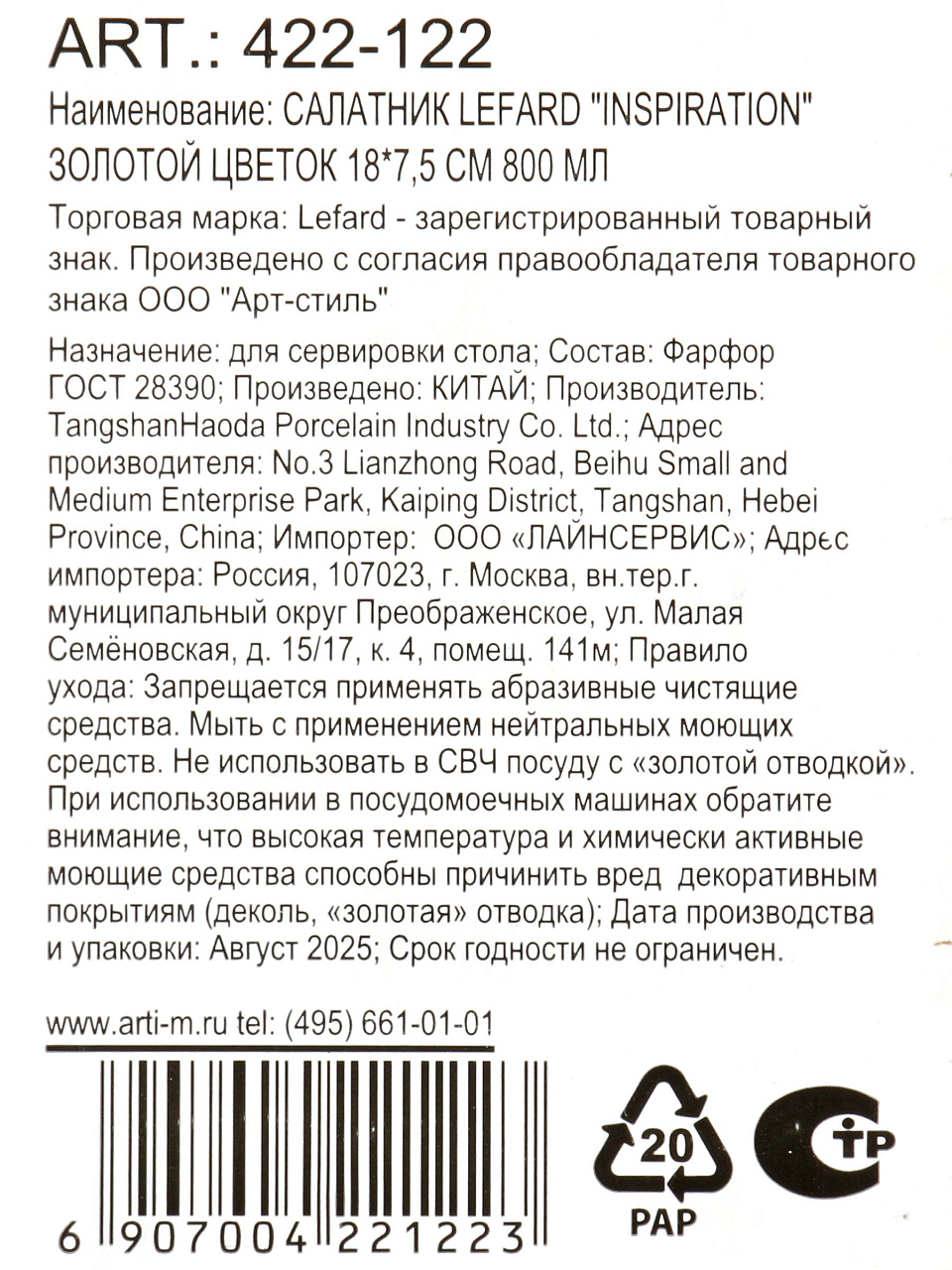 Салатник фарфор, круглый, 18х7 см, 0.8 л, Inspiration Золотой цветок, Lefard, 422-122