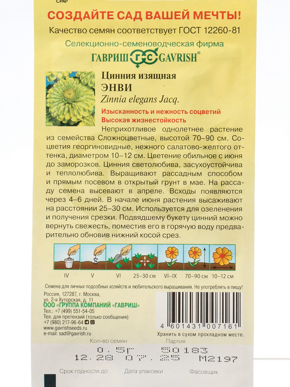 Семена Цветы, Цинния, Энви, 0.5 г, изящная, цветная упаковка, Гавриш