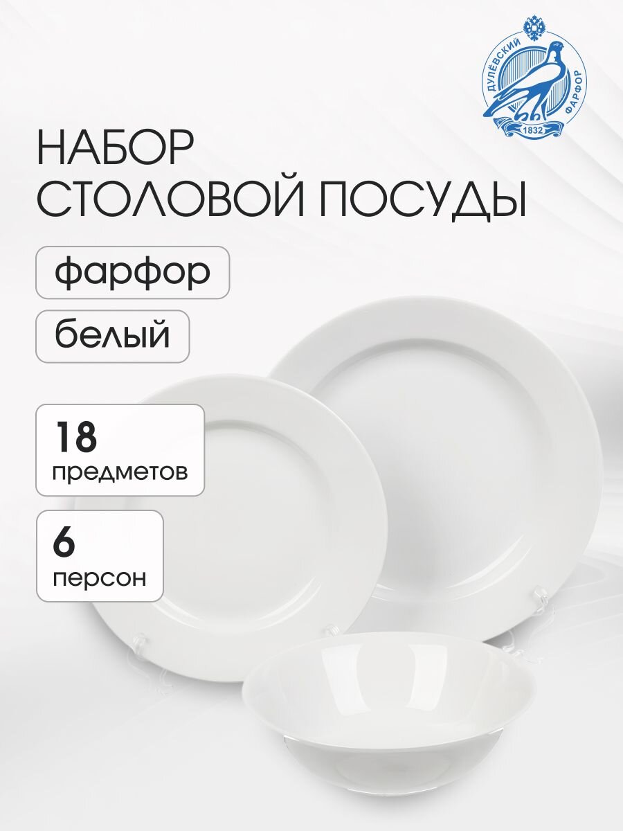 Столовый сервиз из фарфора на 6 персон — 18 предметов Дулевского фарфора: лаконичный белый дизайн, долговечность, подходит для современной кухни и посудомоечной машины.
