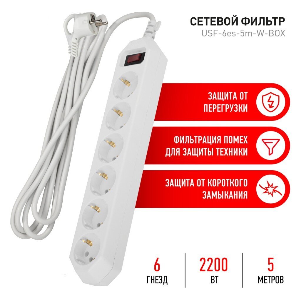 Сетевой фильтр ЭРА USF-6es-5m-W обладает несомненными достоинствами, позволяющими ему стать необходимым атрибутом современного дома. Прочный корпус универсального цвета имеет 6 розеток, каждая из которых имеет заземление. Длина его провода составляет 5 метров, что особенно удобно в пределах одной комнаты. Функционируя как удлинитель, сетевой фильтр ЭРА исключит большое количество лишних проводов.