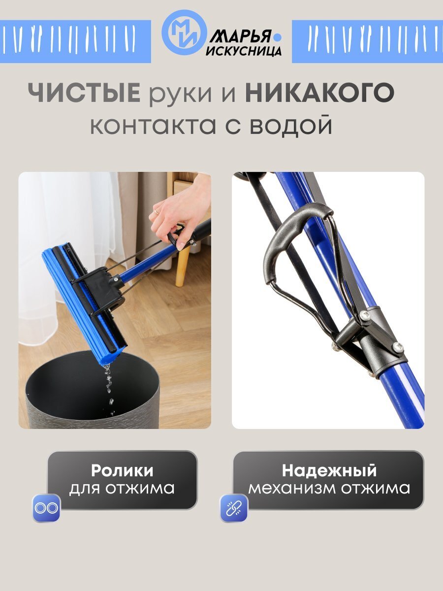 Отжим работает следующим образом: потяните на себя рычаг, ролики прокатятся по губке и удалят лишнюю влагу, благодаря чему ваши руки останутся сухими. У данной швабры телескопическая ручка. На ней имеется специальная регулировка, выдвижной механизм, с помощью которого выставляется оптимальная длина ручки под каждого человека.
