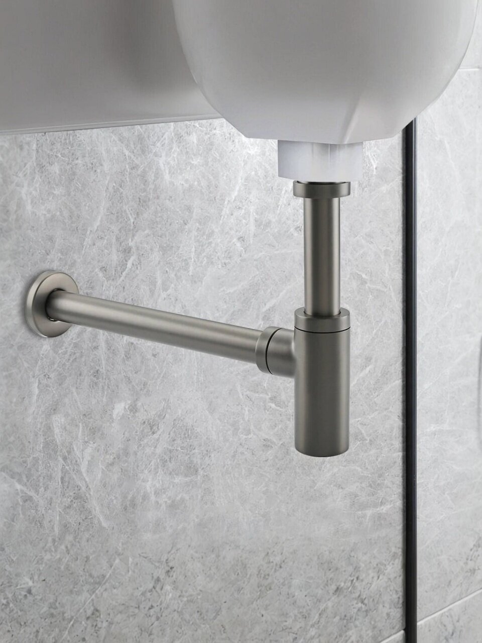 - Матовый серый цвет сифона придает ему изысканность и современность, легко сочетаясь с различными моделями раковин из санфаянса.