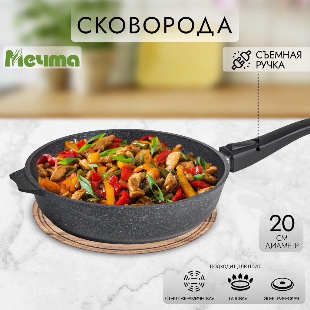 Сковорода литой алюминий 20 см Мечта Гранит black: надежное антипригарное покрытие, съемная ручка, оптимальный размер для дома и дачи — готовьте легко и без лишних хлопот.