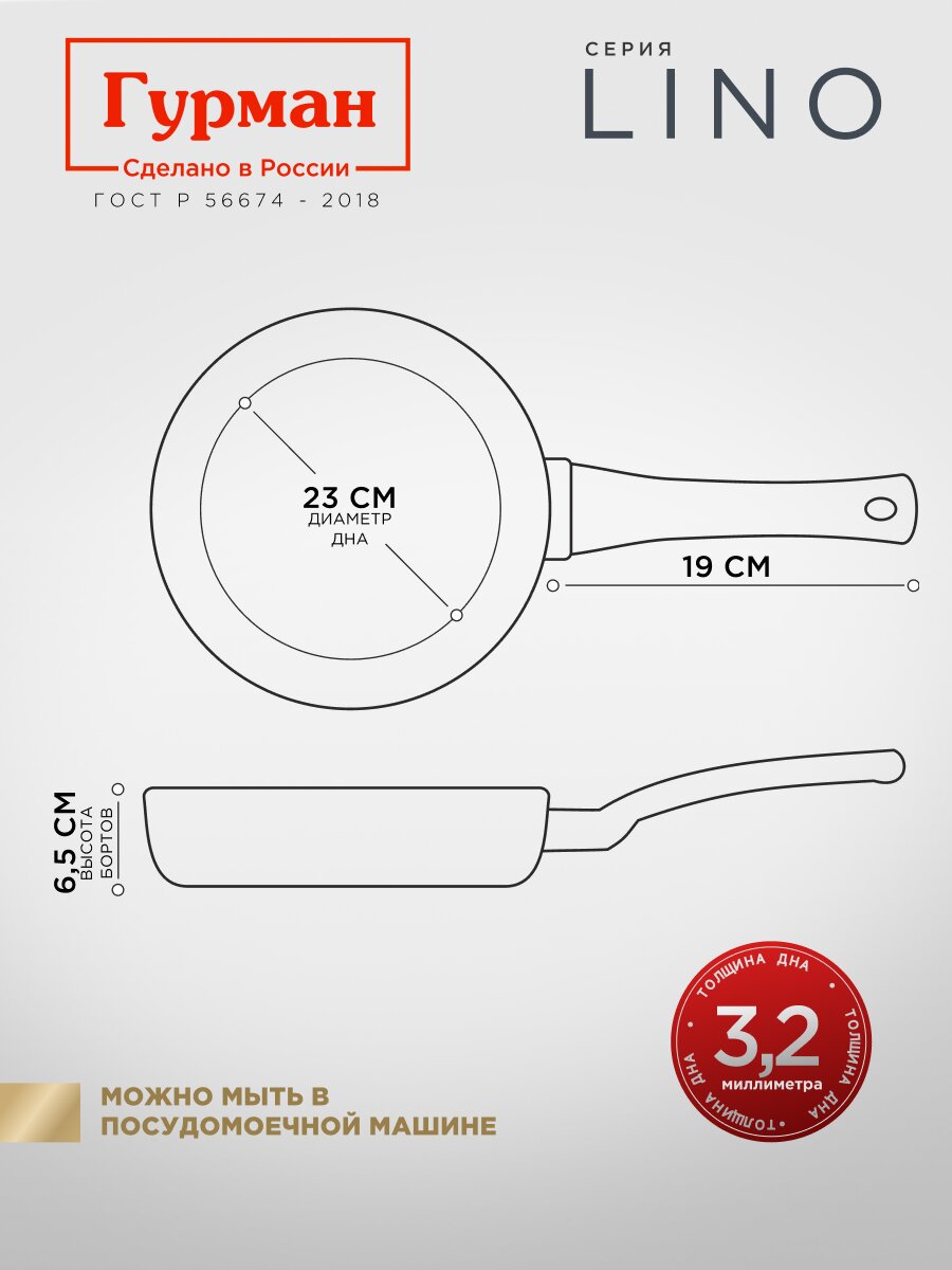 Сковорода Гурман Lino из литого алюминия с антипригарным покрытием PFLUON — оптимальный выбор для тех, кто ищет, какую сковороду купить для индукции или универсального использования. Благодаря толщине дна 3,2 мм и стенок 2,4 мм, жар равномерно распределяется, что позволяет готовить мясо, рыбу, омлеты и оладьи без пригорания. Часто спрашивают: «Подходит ли для посудомоечной машины?» — да, уход максимально простой.