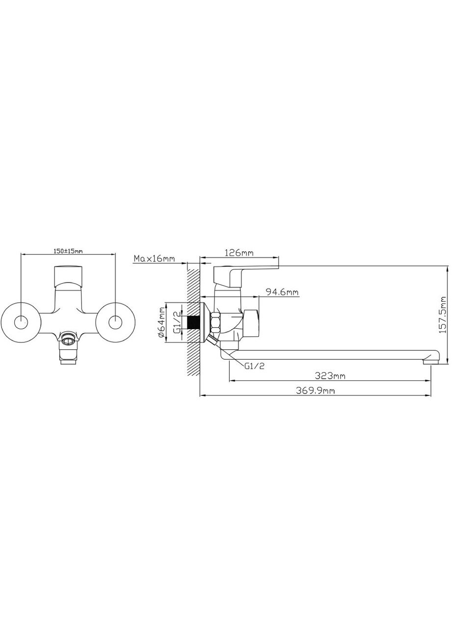 Смеситель устанавливается вертикально на стену, крепление — гайка, требуется 2 монтажных отверстия с межосевым расстоянием 150 мм. Подходит для стандартной разводки ванных комнат.