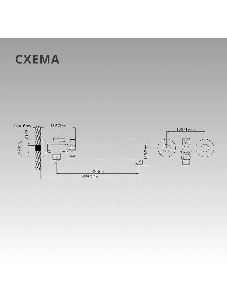 Длина поворотного излива составляет 35 см, межосевое расстояние — 150 мм, монтаж вертикальный на 2 отверстия с креплением на гайку, стандарт подводки — 1/2".