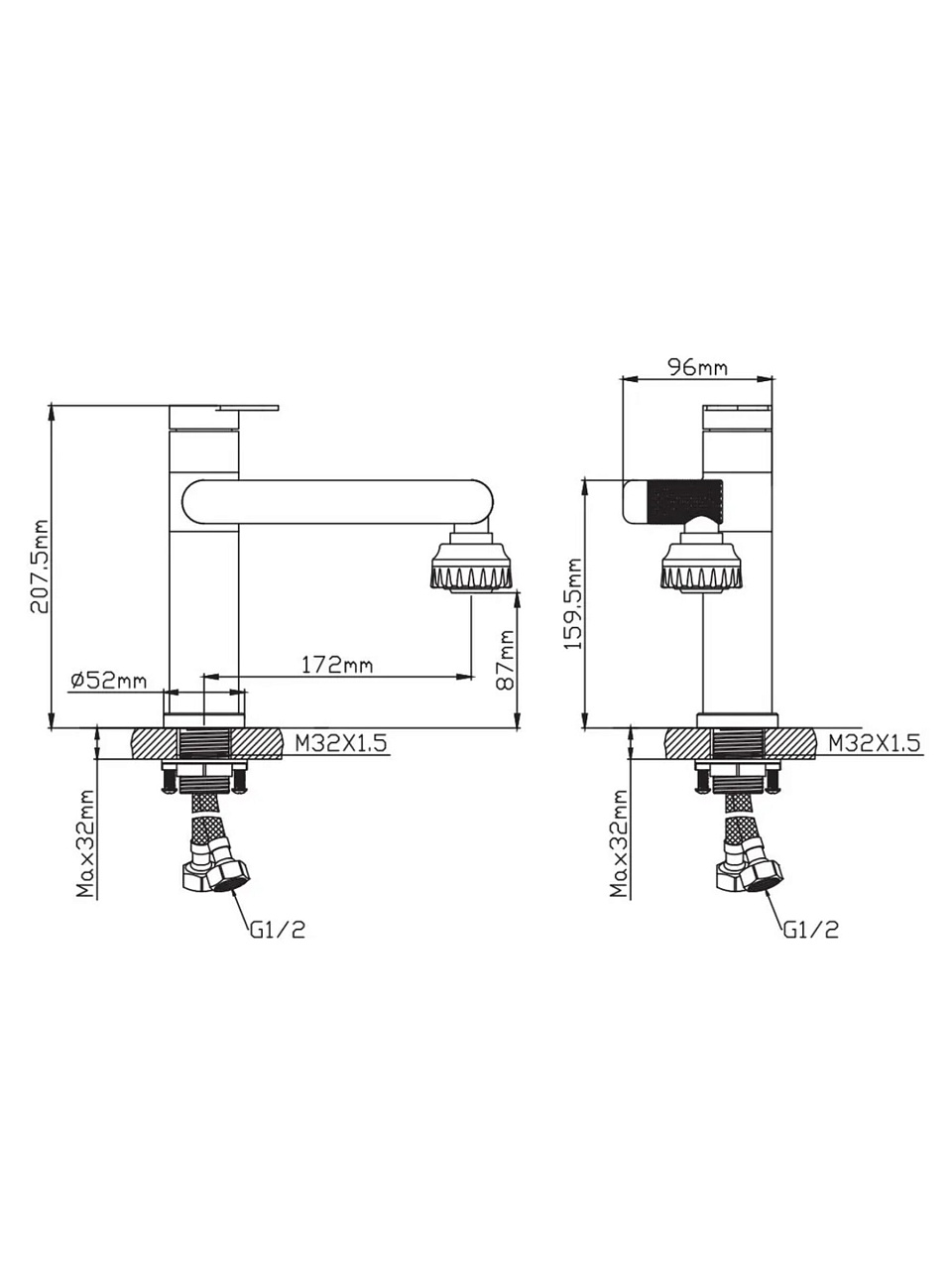 Монтаж горизонтальный, крепление — гайка, стандарт подводки шланга 1/2". Подходит для установки в одно отверстие на стандартной раковине.