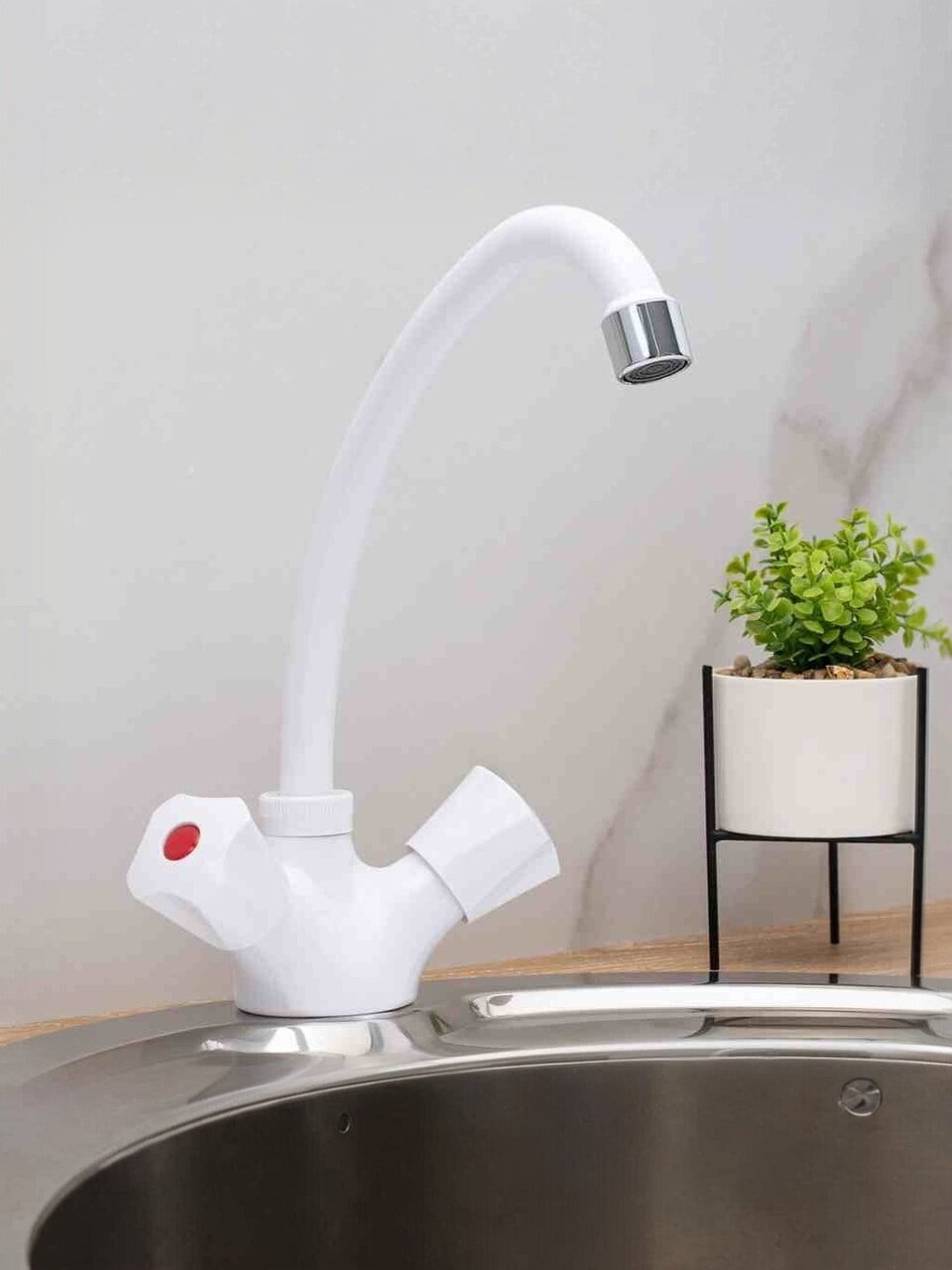 Смеситель для кухни РМС PL4-271F — белый пластиковый корпус, гибкая подводка и аэратор для экономии воды. Идеальное решение для кухни или дачи по выгодной цене.