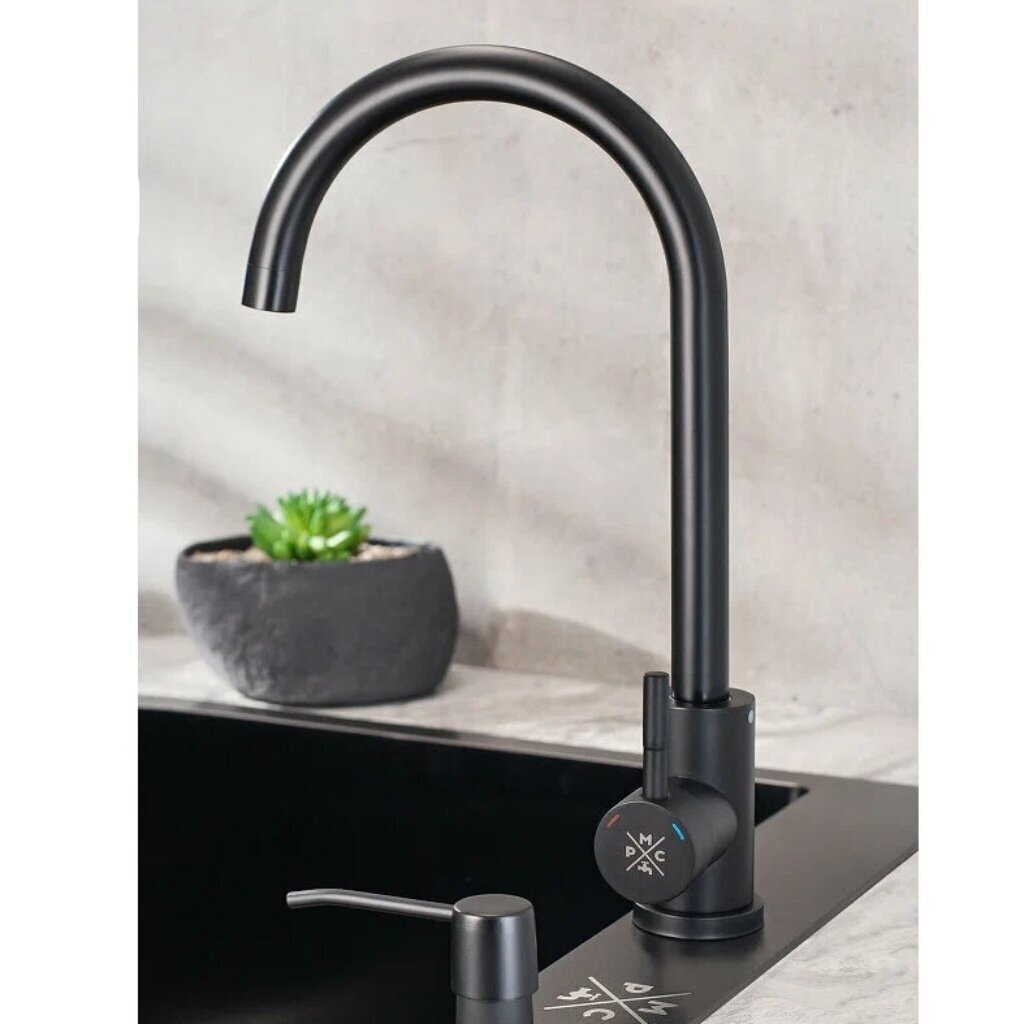 Смеситель для кухни РМС SUS124BL-017F: стильный черный дизайн, долговечная нержавеющая сталь, плавный поворотный излив 24 см — оптимальное решение для современной кухни.