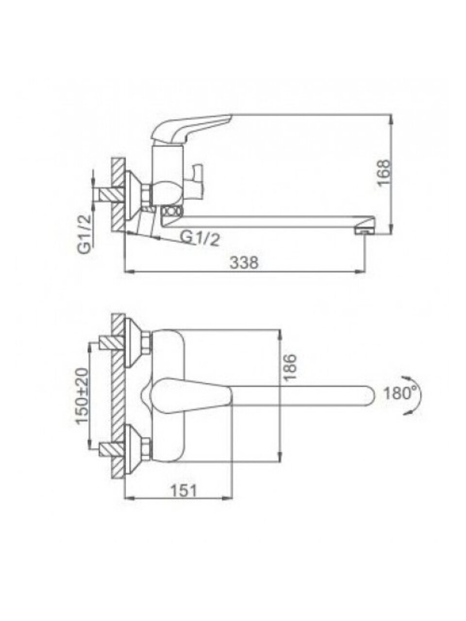 Межосевое расстояние — 150 мм, длина излива — 35 см, монтаж вертикальный, настенный, 2 отверстия для крепления, стандарт подводки 1/2".
