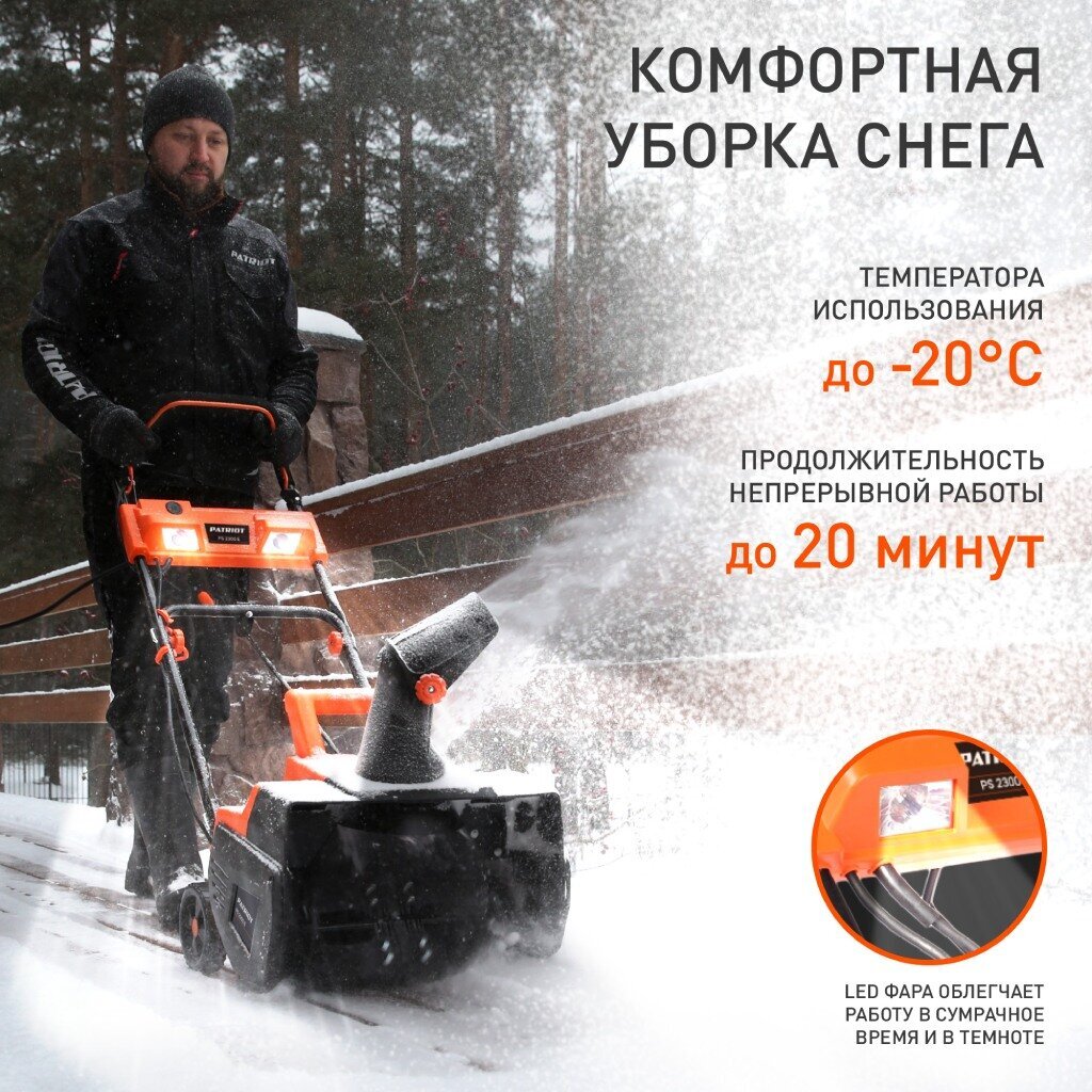 Легкий электрический снегоуборщик Patriot PS 2300 E с ручным управлением и электрическим двигателем поможет быстро очистить от рыхлого снега дачный участок или территорию перед домом. Небольшой вес обеспечивает максимально комфортную и быструю уборку и снижает нагрузку на оператора. Оснащен обрезиненным шнеком, защищающем декоративные покрытия на участке от царапин. Рычаг поворота позволяет изменять угол выброса в зависимости от направления уборки.