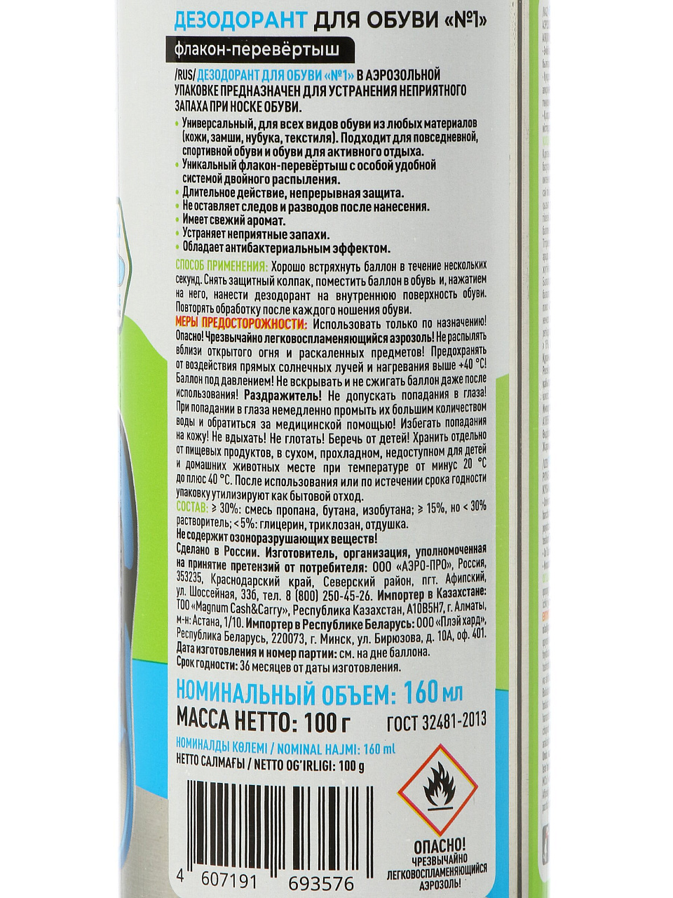 - Удобный объем 160 мл — хватает надолго, бесцветный спрей не оставляет следов на обуви любого цвета и материала.