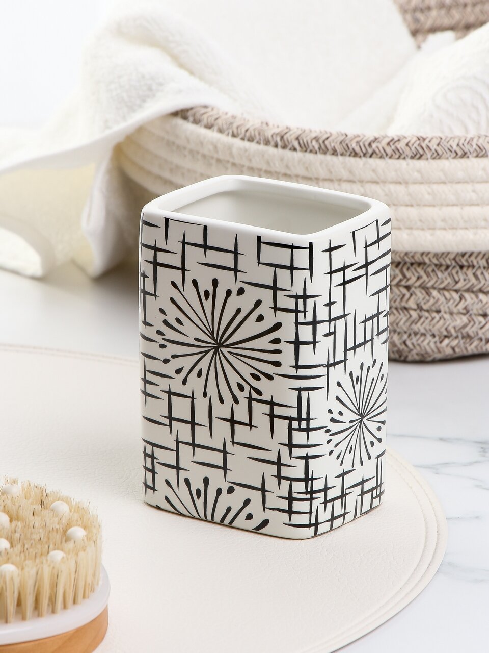 Стакан для зубных щеток из керамики с узором «бежевая паутинка» — это не просто аксессуар, а элемент декора, который сочетает эстетику и практичность. Благодаря прямоугольной форме и компактным размерам, он легко размещается даже на небольшой полке или раковине, не занимая лишнего пространства. Глянцевая поверхность устойчива к загрязнениям и проста в уходе — достаточно протереть влажной салфеткой.