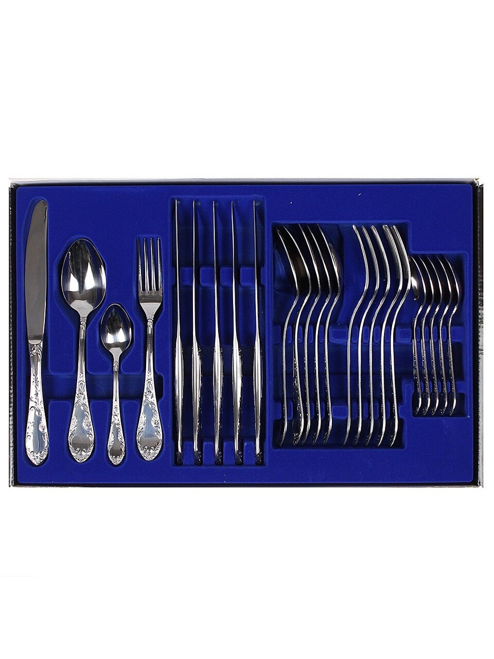 В комплекте 24 предмета длиной 20 см, с фигурными металлическими ручками, художественной росписью, в классическом серебристом цвете. Подходит для столовых и чайных сервировок.