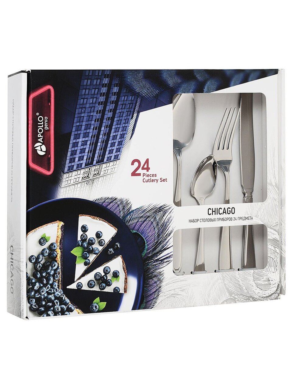 Набор столовых приборов Apollo Chicago (24 предмета) — стильный выбор для семьи и подарка: долговечная нержавеющая сталь, подходит для мытья в посудомоечной машине, рассчитан на 6 персон.