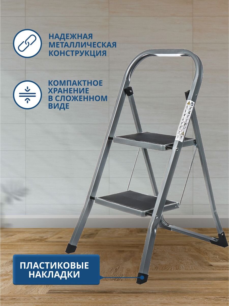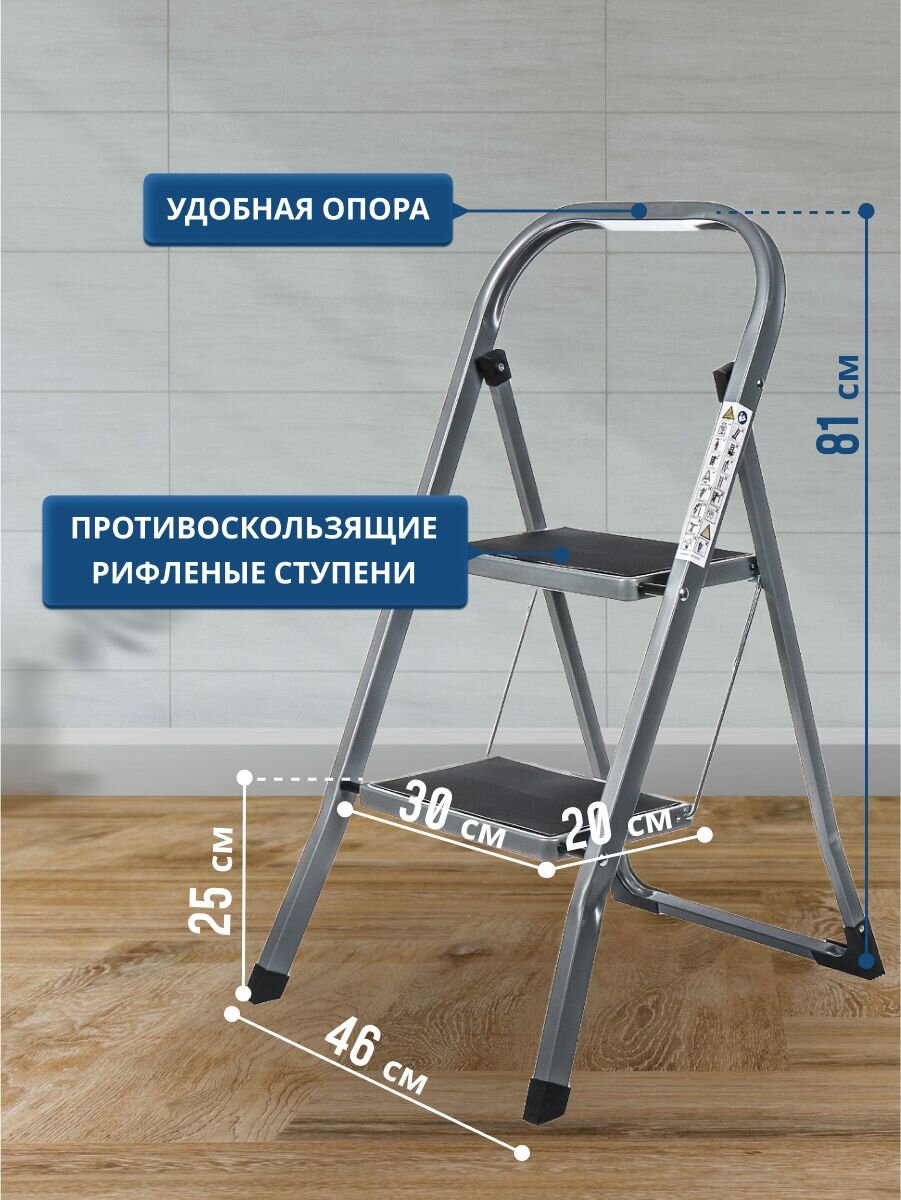 - Стремянка имеет две ступени, что делает ее удобной для выполнения работ на разных высотах. Вы можете легко достать до высоких полок, заменить лампочку или выполнить другие работы, не используя дополнительные инструменты.