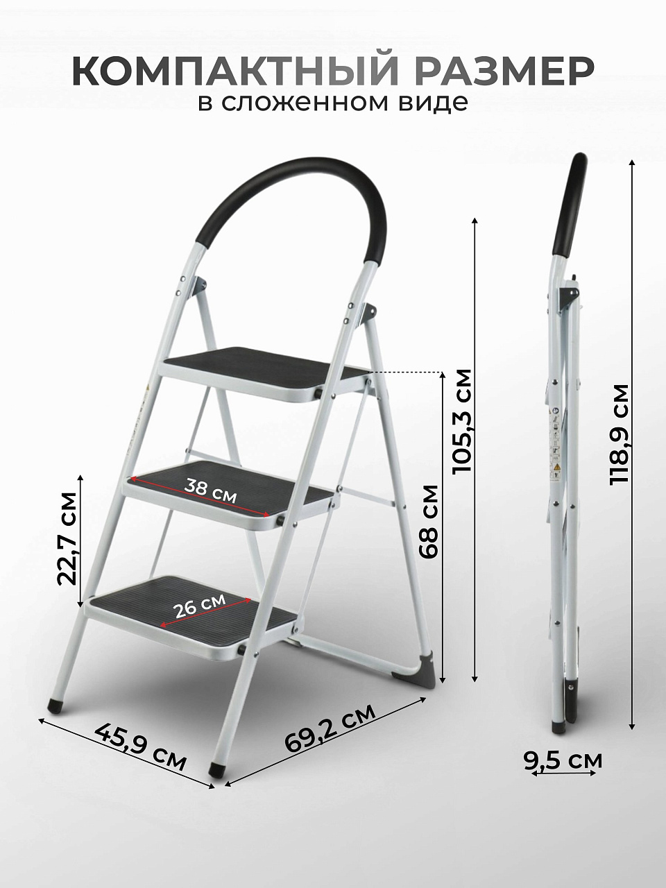 - Компактность: благодаря складной конструкции, стремянка не займет много места при хранении.