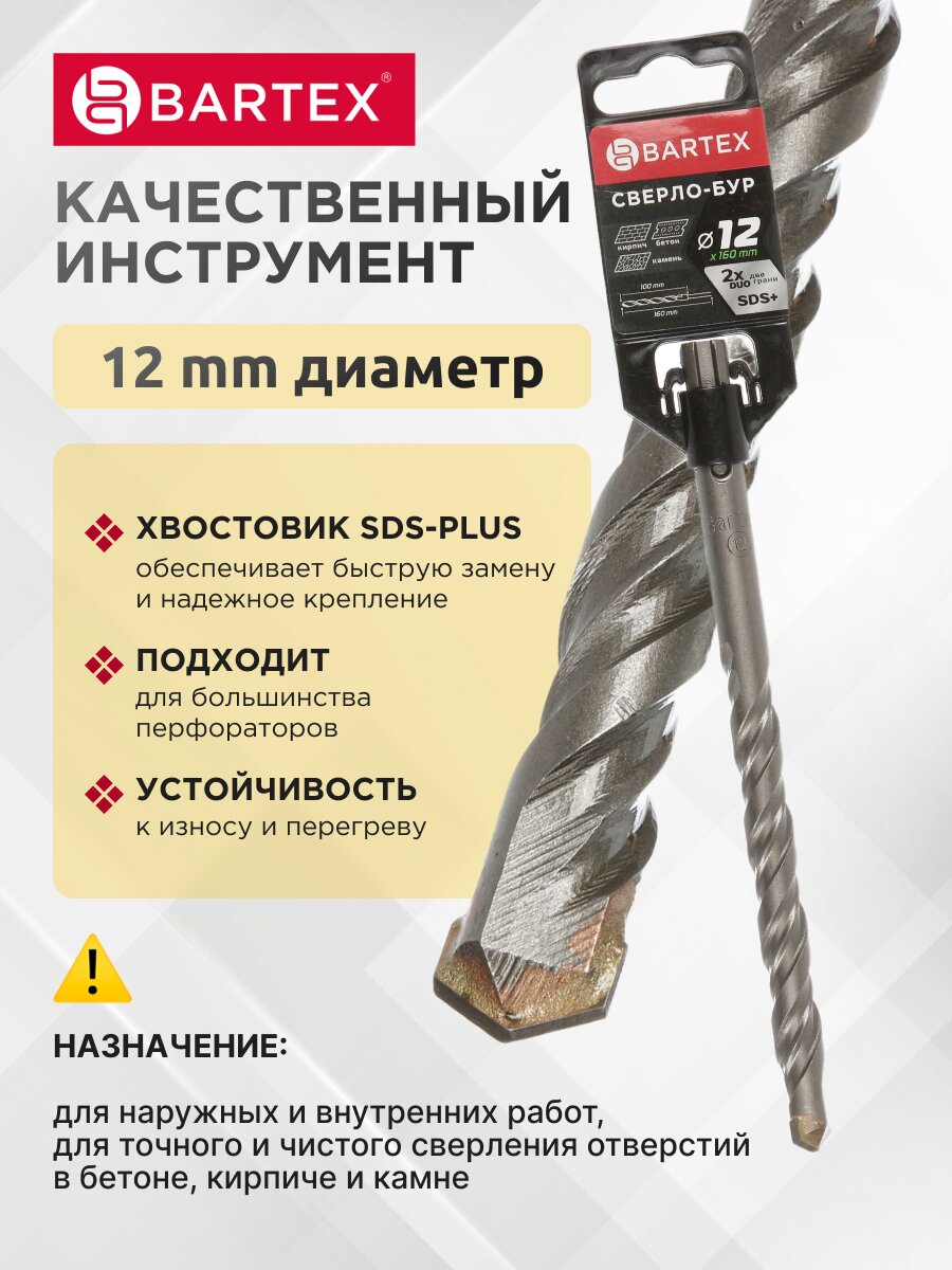 Сверло-бур Bartex d12x100x160 мм SDS-Plus — точное сверление бетона и кирпича, долговечность и надежность для любых задач дома и на даче.