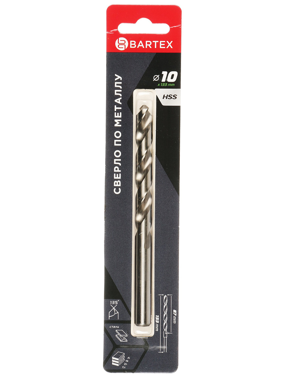 Диаметр сверла Bartex HSSM2 — 10 мм, общая длина — 133 мм, рабочая длина — 87 мм. Это позволяет сверлить отверстия стандартных размеров в листовом и профильном металле.