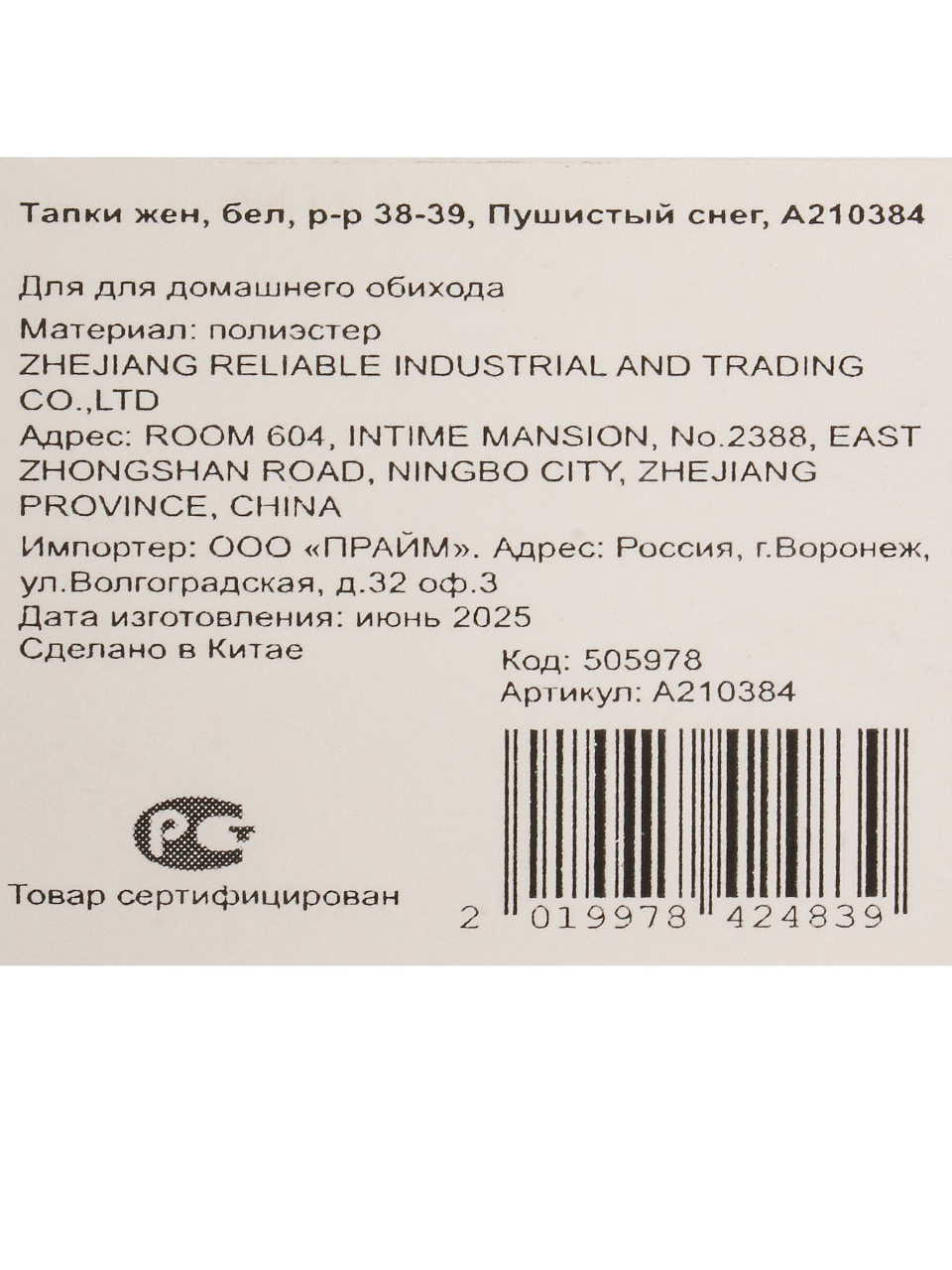 Тапки жен, бел, р-р 38-39, Пушистый снег, A210384