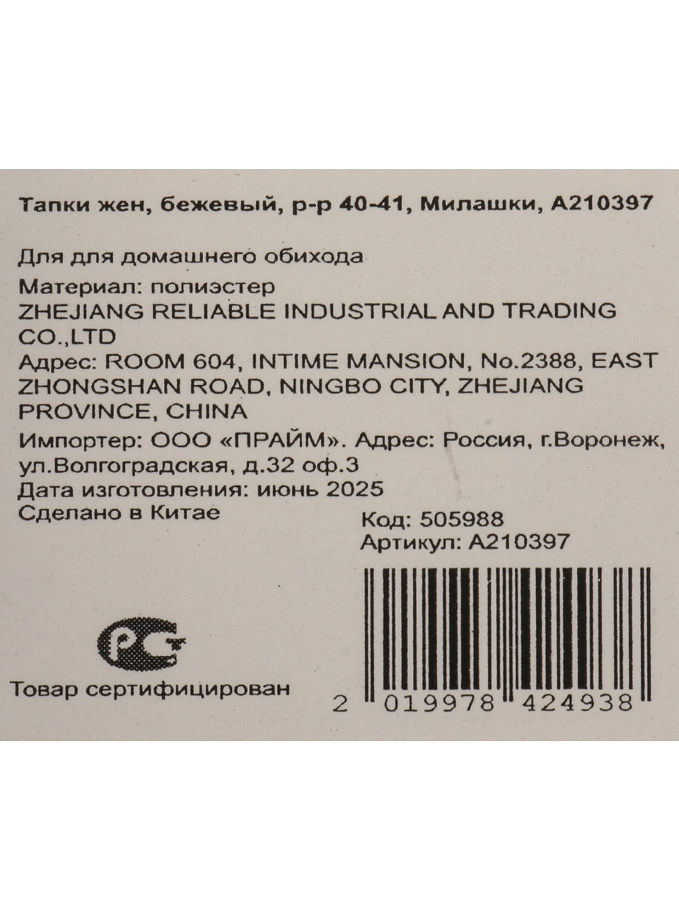 Тапки жен, бежевый, р-р 40-41, Милашки, A210397