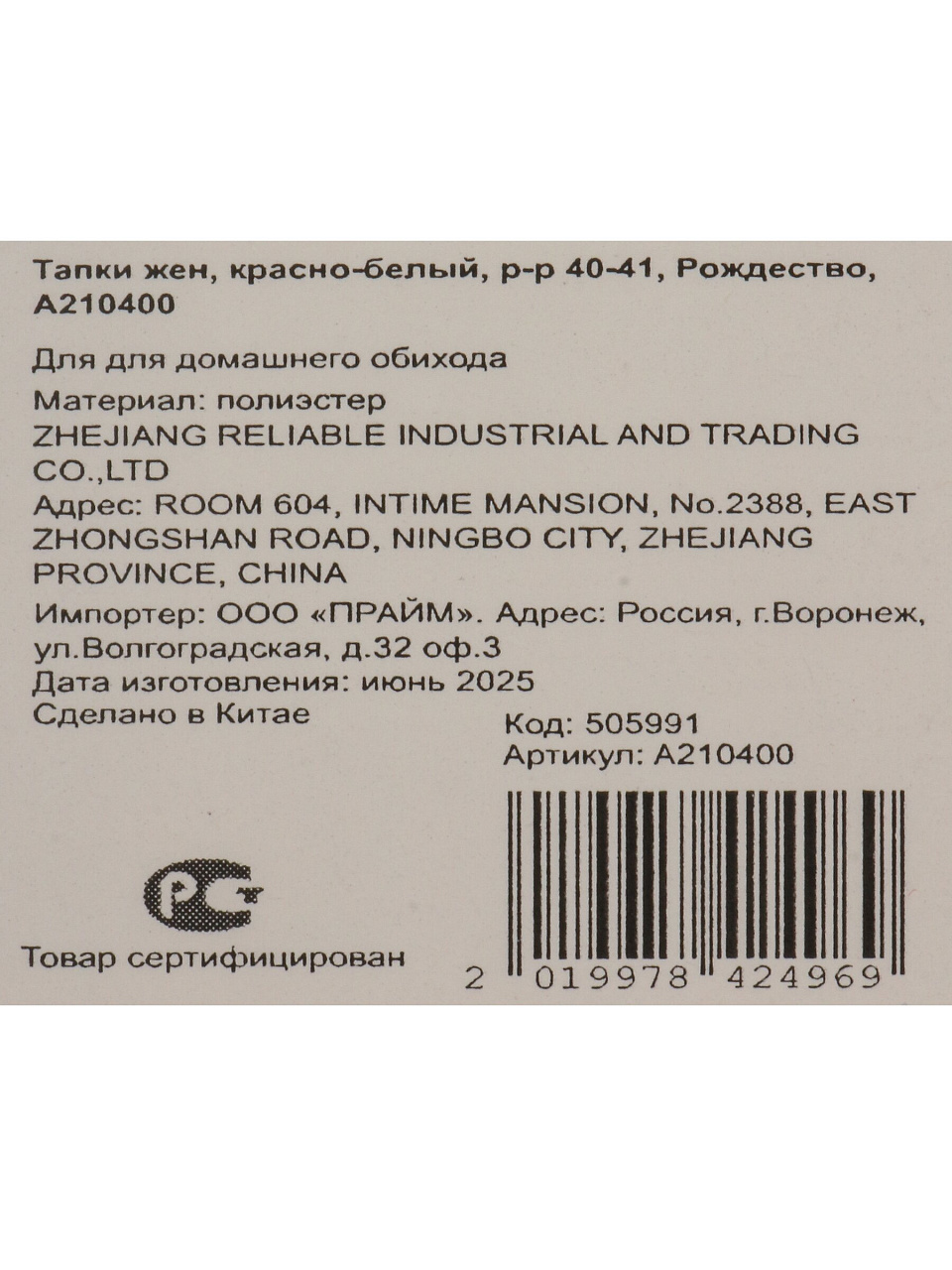 Тапки жен, красно-белый, р-р 40-41, Рождество, A210400