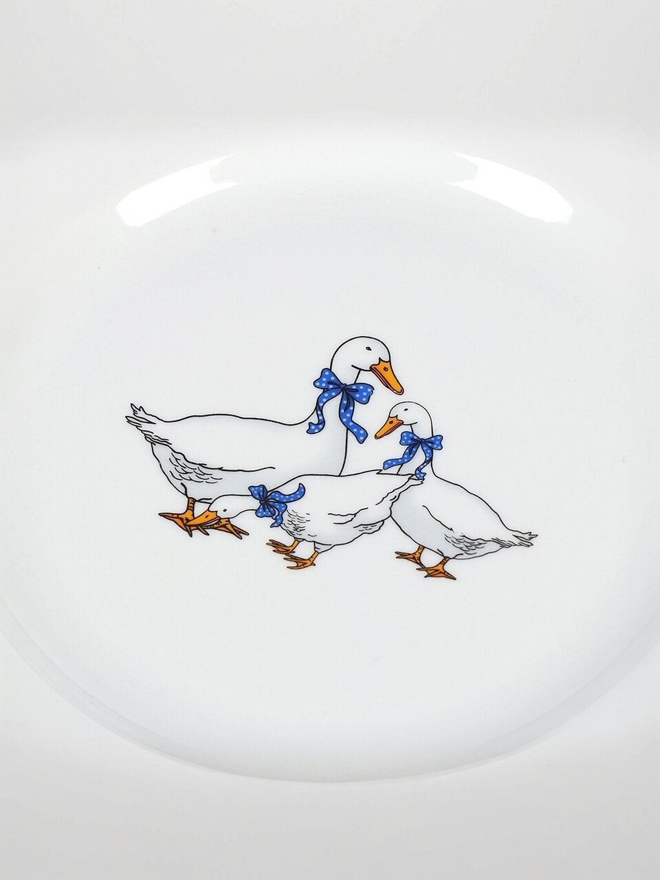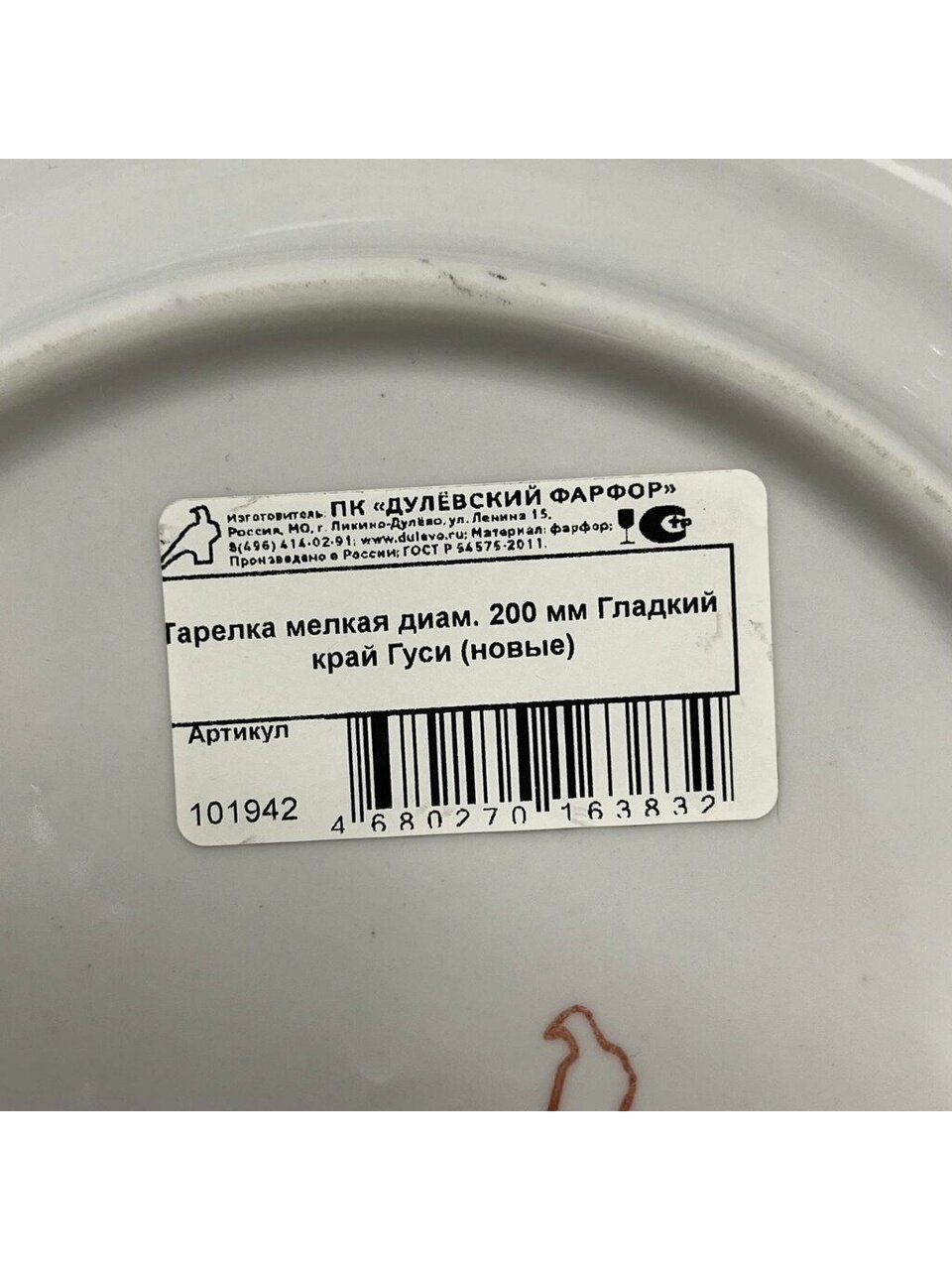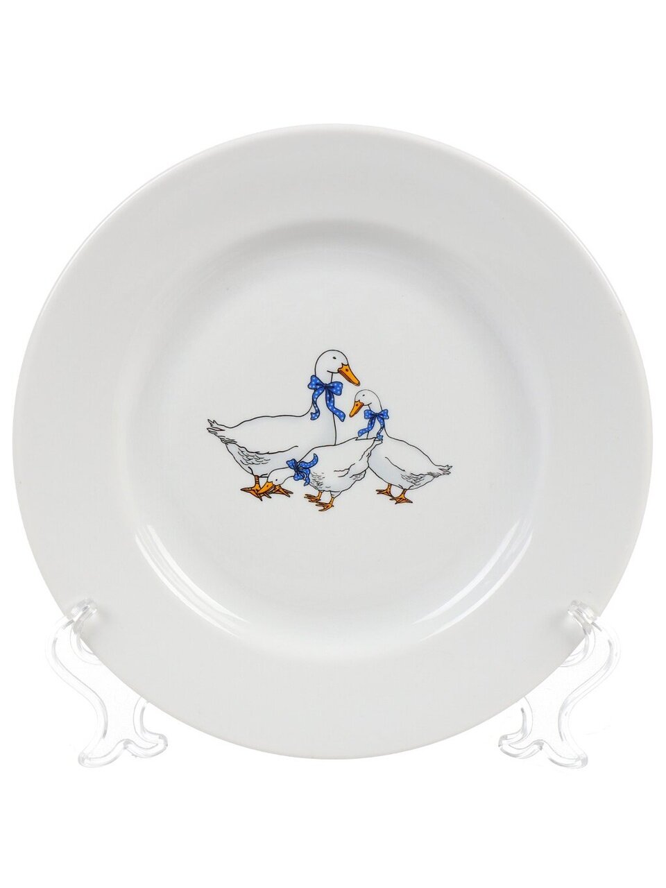 Диаметр 20 см, круглая форма, гладкий край, белый цвет с рисунком гусей — оптимально для сервировки вторых блюд и закусок.
