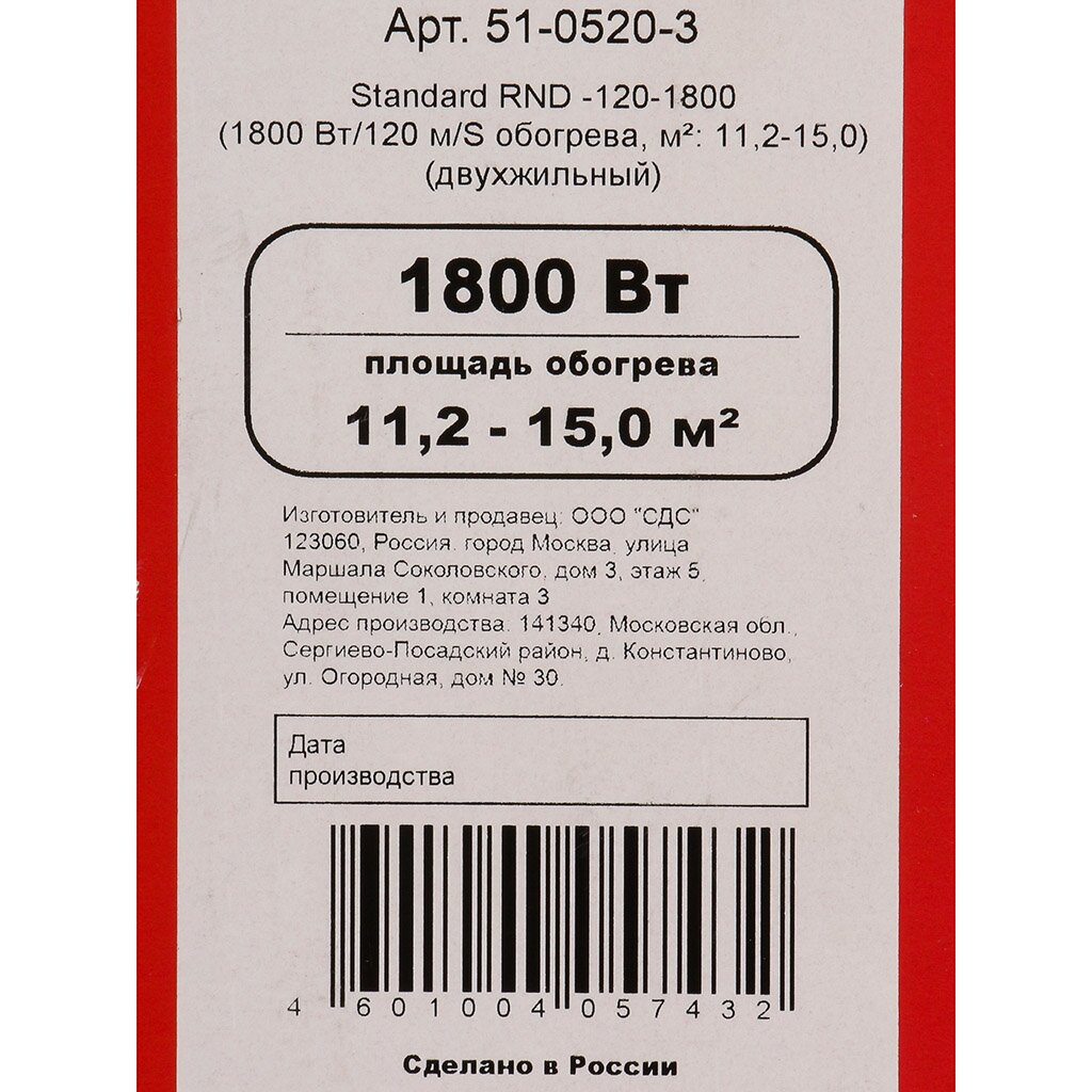 - Длина 120 м, мощность 1800 Вт — равномерный прогрев пола на площади 11,2-15,0 м², подходит для различных напольных покрытий.