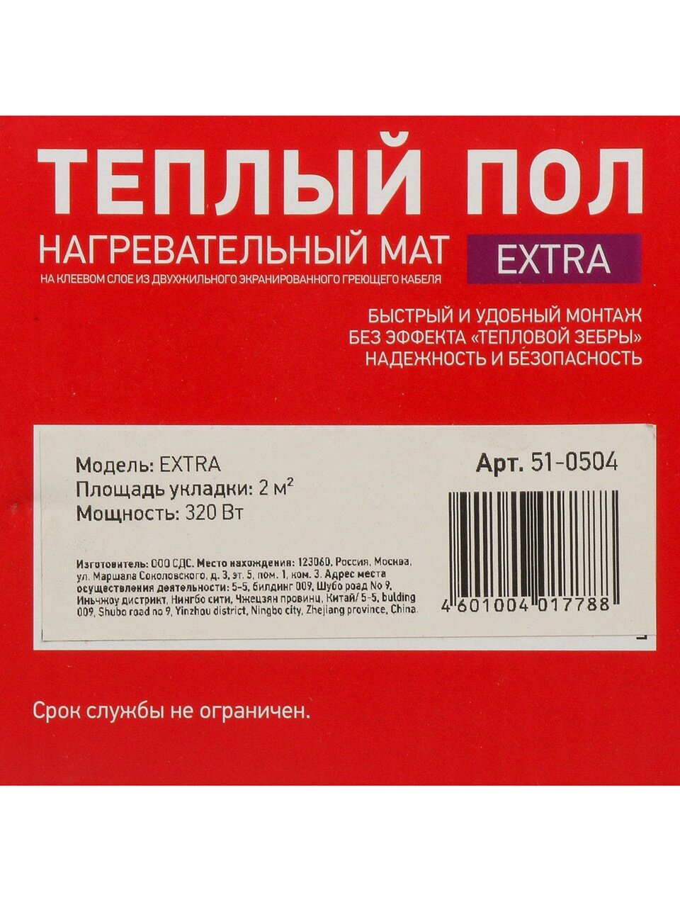 Площадь обогрева — 2 м², мощность — 320 Вт, размеры — 0.5×4 м, диаметр кабеля — 3,8 мм, изоляция — фторопласт, степень защиты — IP67, страна производства — Китай.