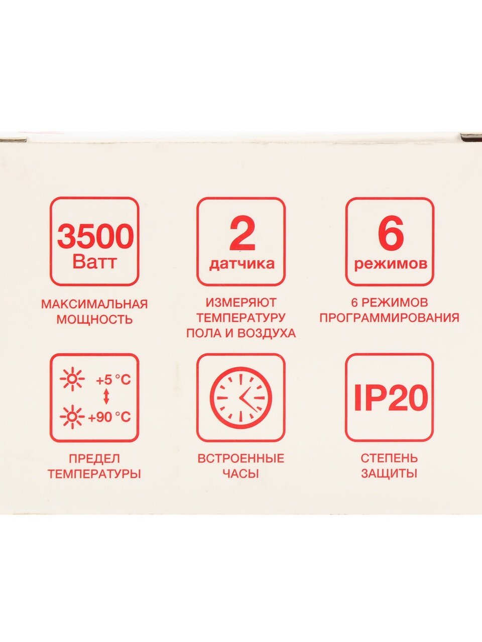 - Безопасность и долговечность: прочный пластик, защита IP20, длина кабеля датчика 3 м, мощность до 3680 Вт.