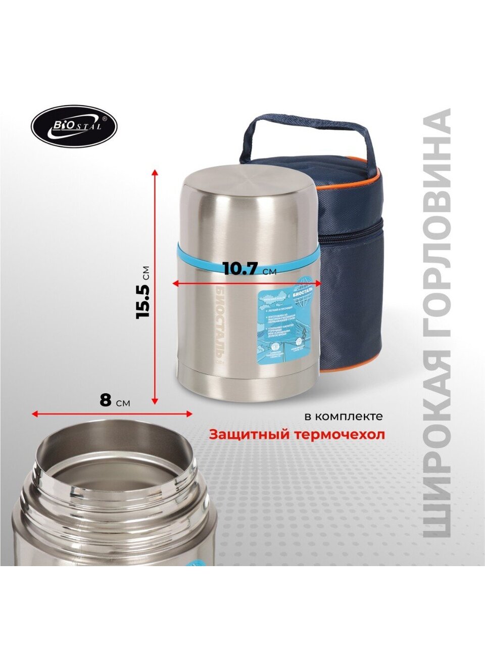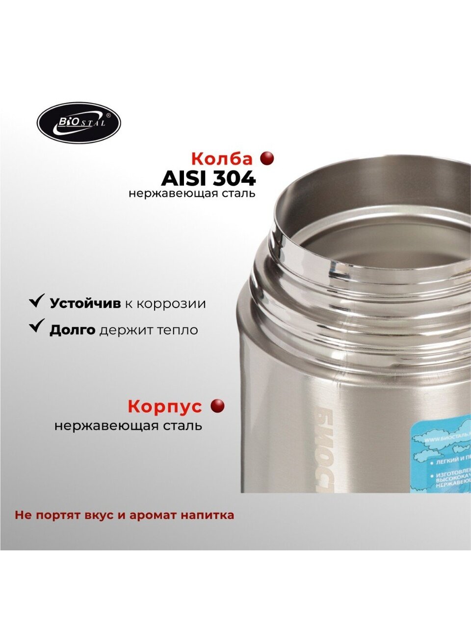 Термос для еды Biostal Авто 0.6 л: сохраняет тепло до 16 часов, ударопрочный корпус из нержавеющей стали, широкая горловина для удобства наполнения и мытья.