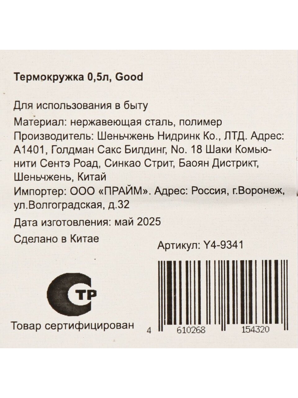 Термокружка из нержавеющей стали 0.5 л Good Y4-9341: сохраняет напитки горячими и холодными до 6 часов, оптимальна для города, спорта и автомобиля.