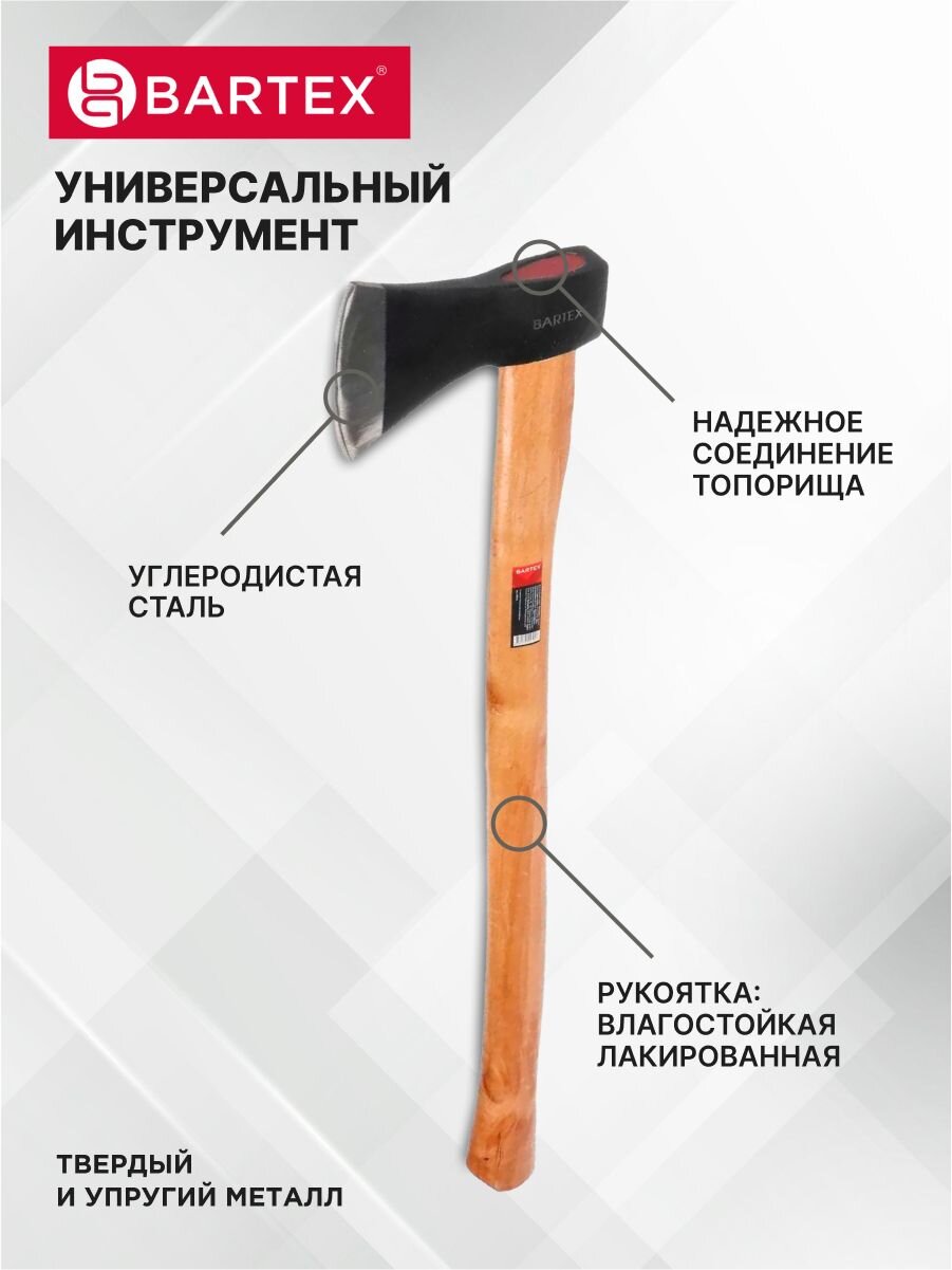 Топор Bartex способен на порядок облегчить трудозатратный процесс колки дров и обработки древесины. Небольшой вес изделия снизит усталость Ваших рук даже при продолжительной работе. А гладкая и приятная на ощупь рукоятка подарит дополнительный комфорт.