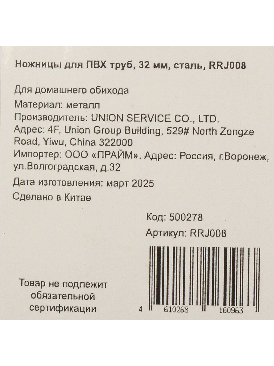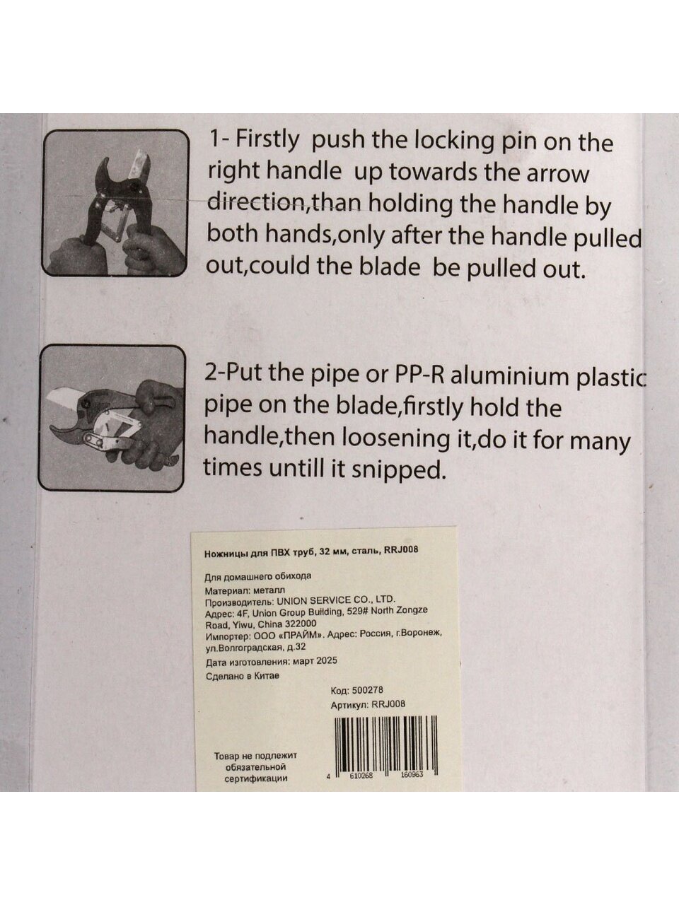 Ножницы для ПВХ труб, 32 мм, сталь, RRJ008 — надежный инструмент для точной и быстрой резки пластиковых труб. Подходят для работ по дому и на даче, обеспечивая чистый срез без заусенцев. Прочные лезвия из стали гарантируют долгий срок службы и аккуратный результат. Компактные размеры позволяют использовать инструмент даже в труднодоступных местах. Экономия времени и усилий при монтаже сантехнических систем.