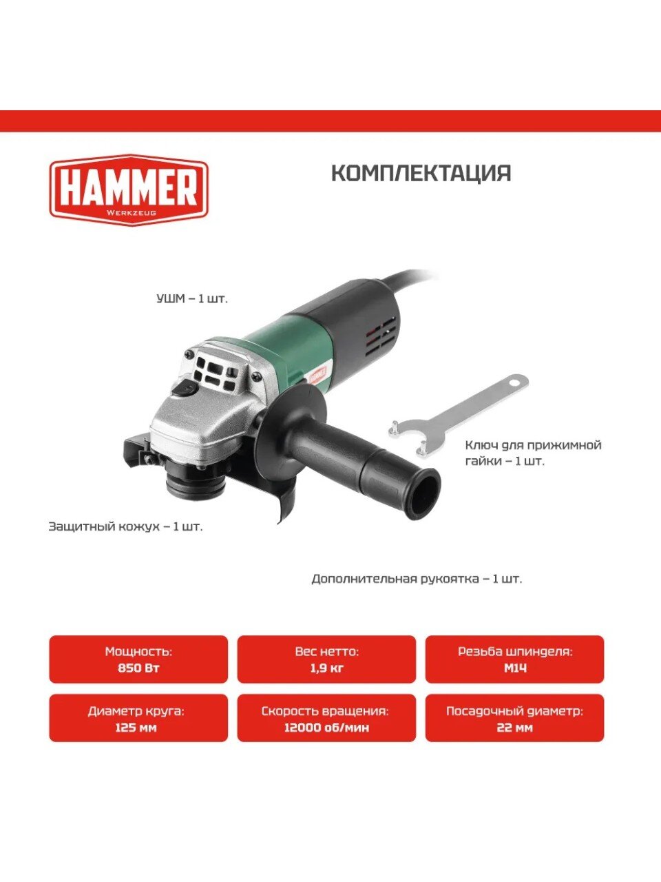 Угловая шлифмашина Hammer USM850D 850 Вт: точный рез и шлифовка металла, камня, пластика для дома и дачи — надёжно, удобно, выгодно.