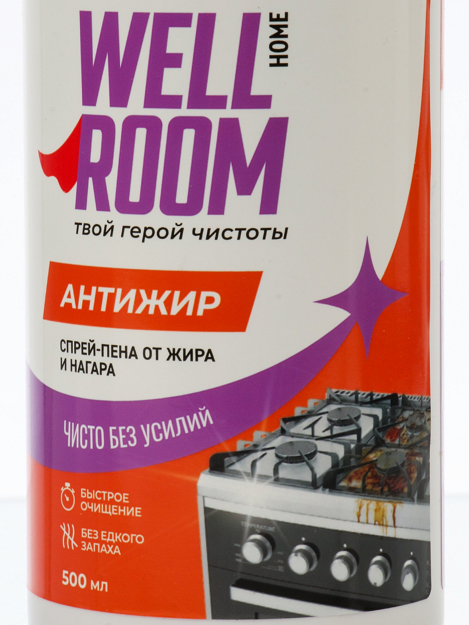 Мощный спрей-пена Wellroom «Антижир» 500 мл: быстрое удаление жира и запахов с кухни, плиты и кафеля. Эффективно, удобно, с ароматом цитруса.