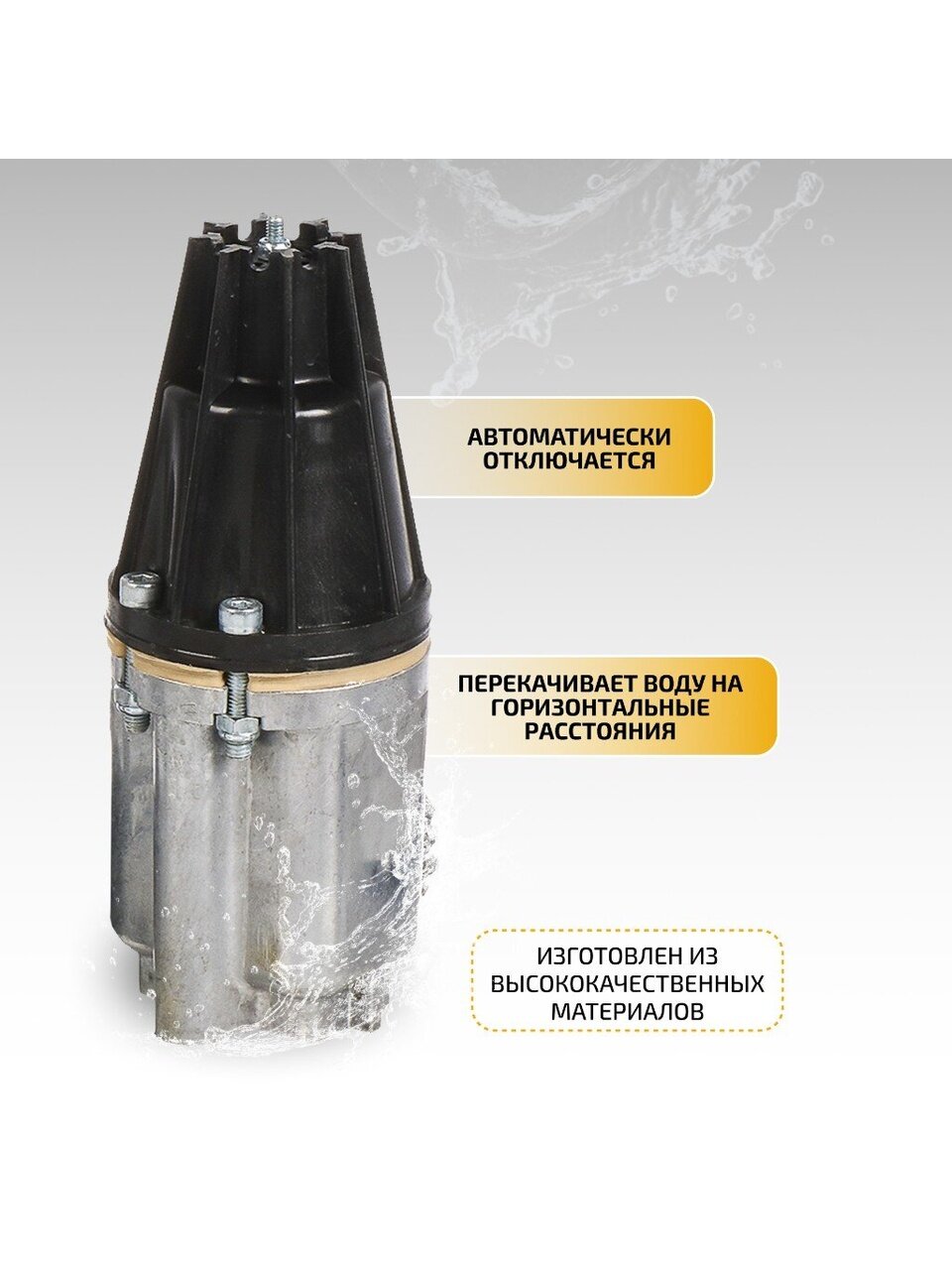 - Автоматически отключается при достижении максимальной нагрузки, что предотвращает повреждение насоса и обеспечивает его долговечность.