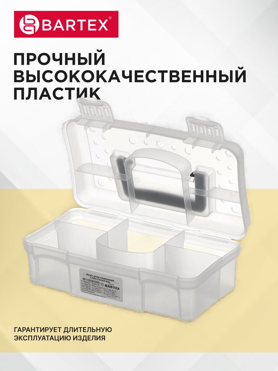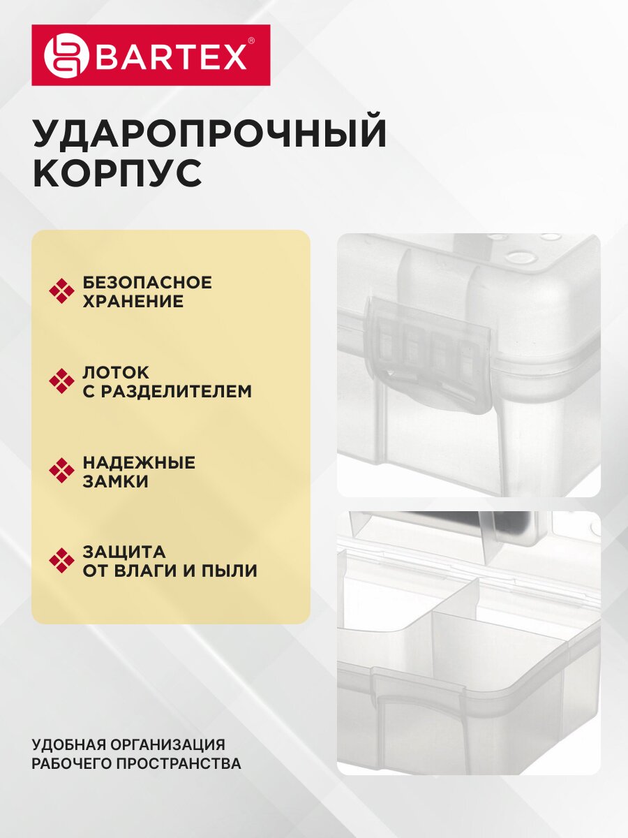 Ящик Bartex — это незаменимый помощник для любого мастера. Он выполнен из прочного материала, который обеспечивает надёжную защиту содержимого от повреждений и влаги. Внутри ящика есть несколько отделений для удобного размещения всего необходимого.